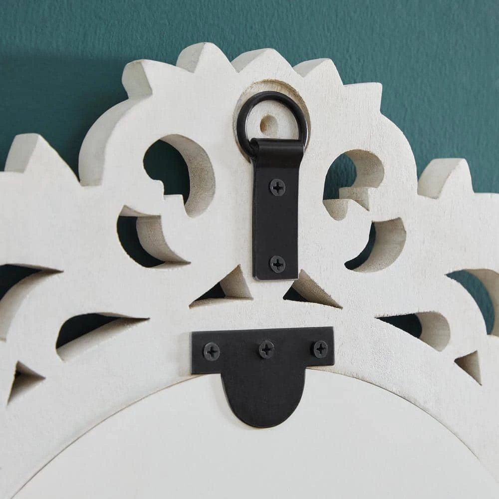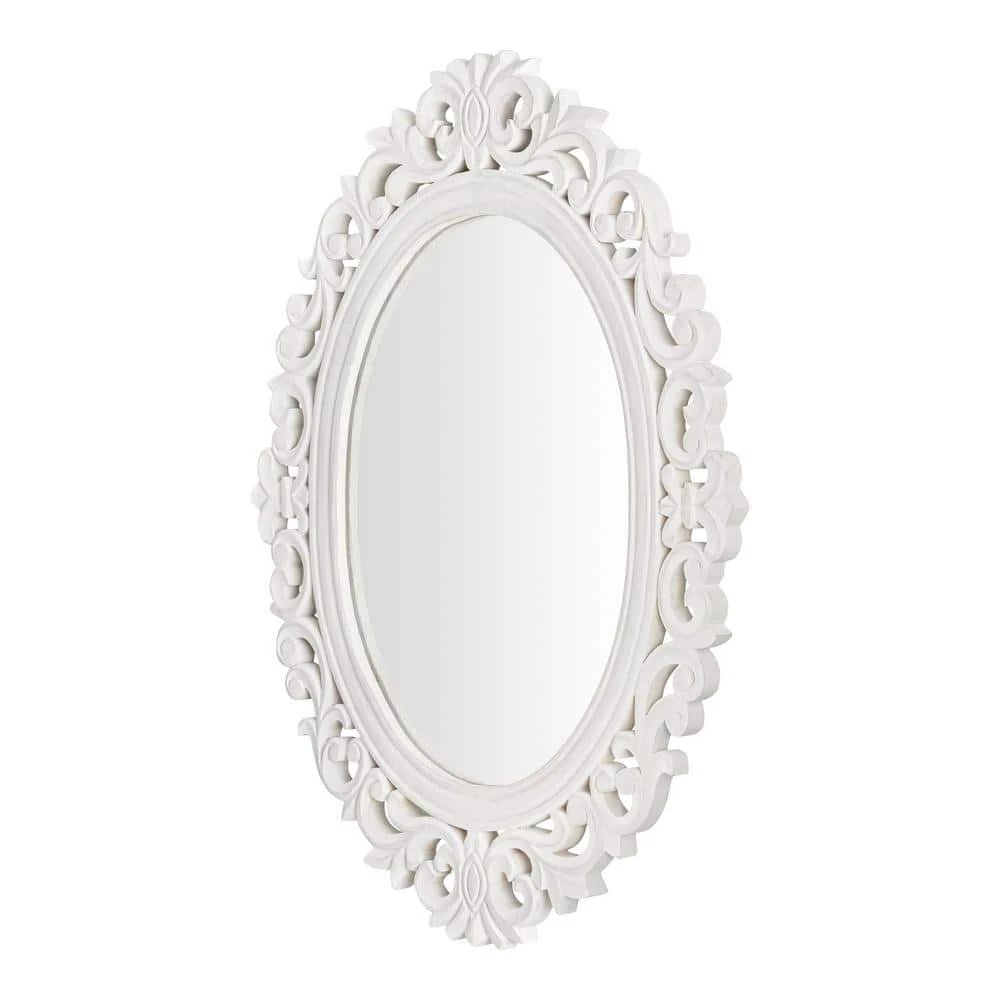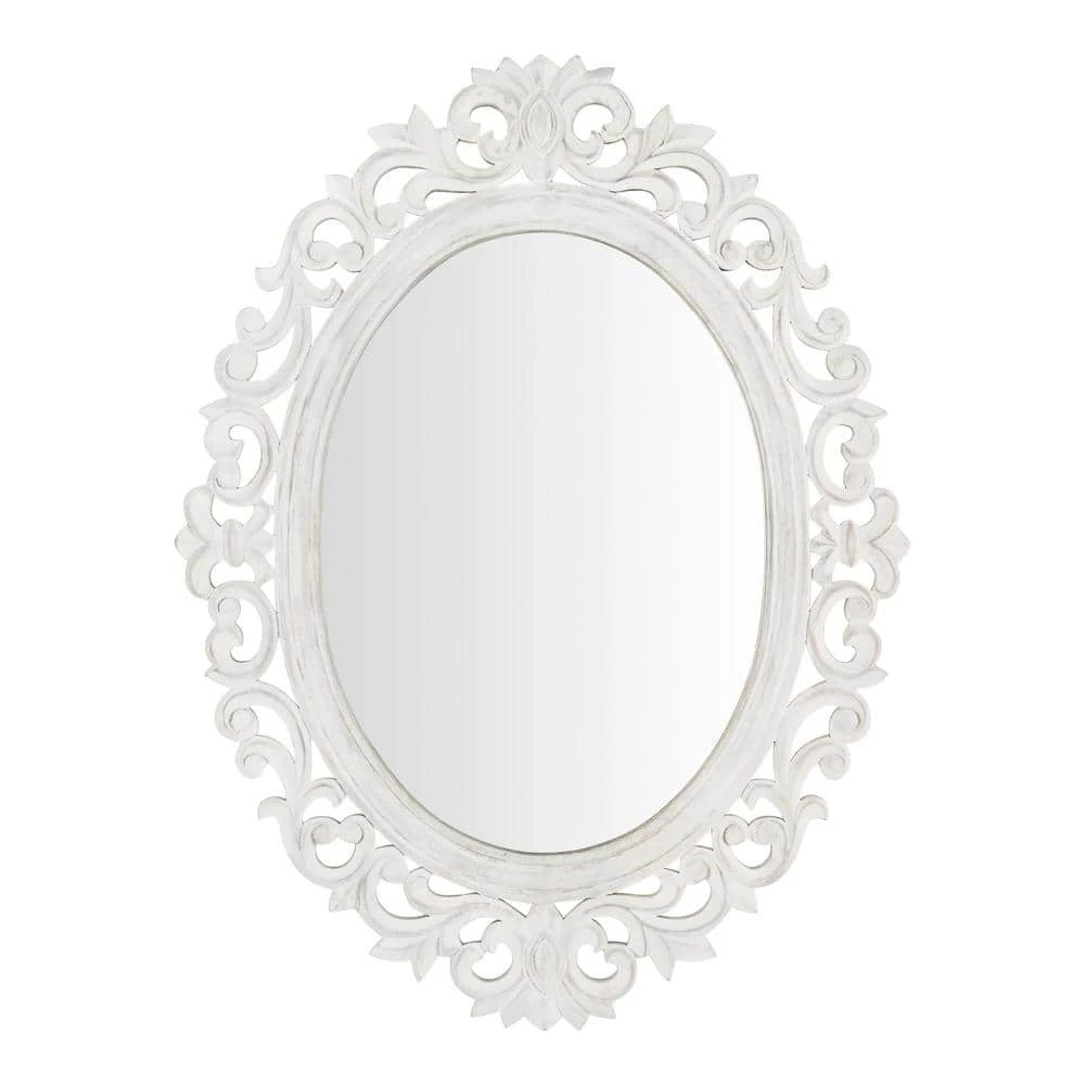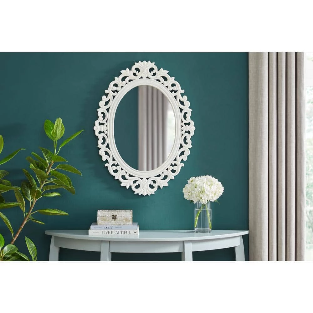 Add classic glamor to your bedroom or dining area with this Home Decorators Collection Classic Oval White Wood Framed Mirror. The handcrafted wooden frame features a lavish carved pattern, offering Victorian-style elegance and elevating the look of your space. Made from mango wood, the durable frame offers long-lasting appeal. An appealing whitewash finish highlights the rich woodgrain on this Home Decorators Collection white oval framed accent mirror, and the pre-attached D-ring hook ensures quick mounting.