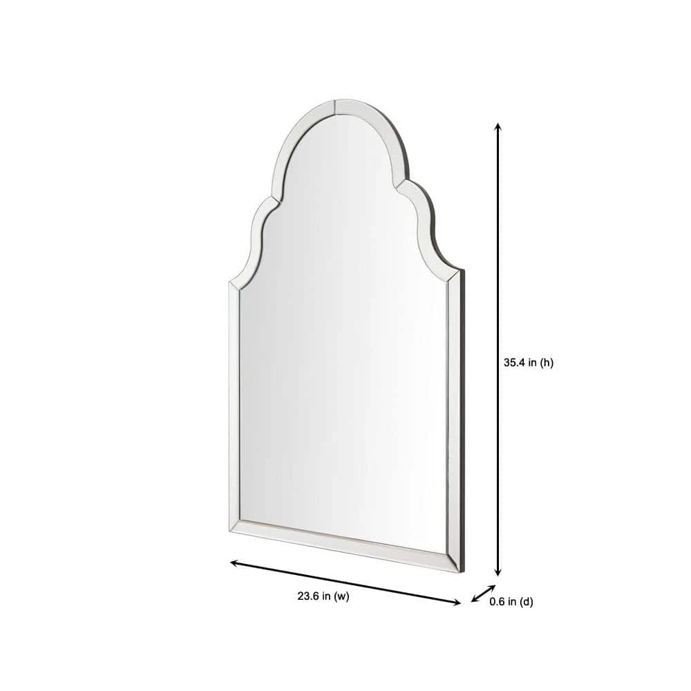 Brighten up your foyer or living room with the Medium Ornate Arched Beveled Glass Classic Accent Mirror from Home Decorators Collection. Its silver composite frame blends seamlessly with the silver reflective surface for a frameless appearance. With its unique arched shape and neutral color, this decorative mirror makes for an ideal addition to a classic-style setting. The D-rings on the back enable easy hanging and stable placement. Wipe the mirror using standard glass cleaner and a soft cloth to keep it spotless and shiny.
