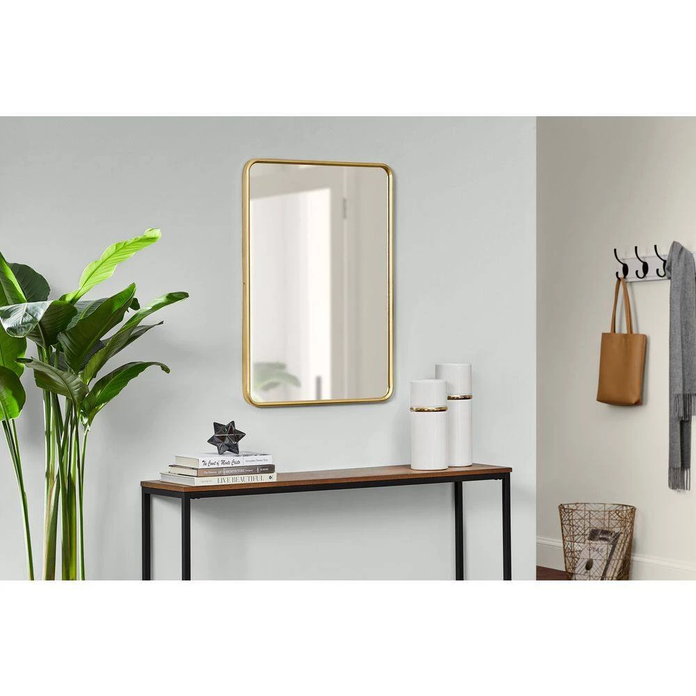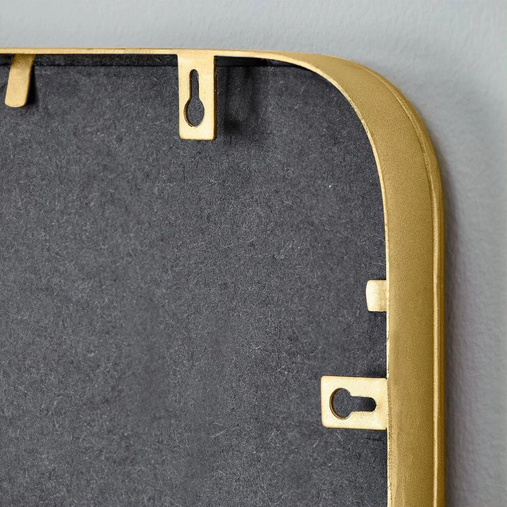 Transform your hallway, living room or bedroom with this Home Decorators Collection Medium Rectangle Gold Framed Mirror. The rectangular frame in a gold finish brings a classic look to your bare wall space, while the metal construction delivers enduring quality. The vertical orientation complements your indoor decorative scheme. This Home Decorators Collection Rectangle Thin Framed wall mirror wipes clean with a standard glass cleaner and a soft cloth for worry-free upkeep.