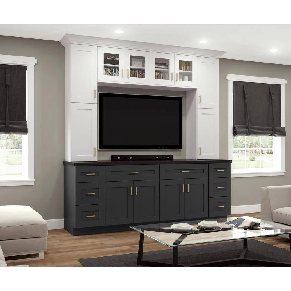 The Navarre Deep Onyx collection from Home Decorators Collection features a durable onyx gray painted finish which will create a classic, bold feel in any kitchen. Shaker-style doors and drawer fronts are crafted from solid MDF with a flat recessed center panel. Cabinets feature CARB compliant all-plywood construction, with full-depth 3/4 in. thick adjustable shelves for added storage.