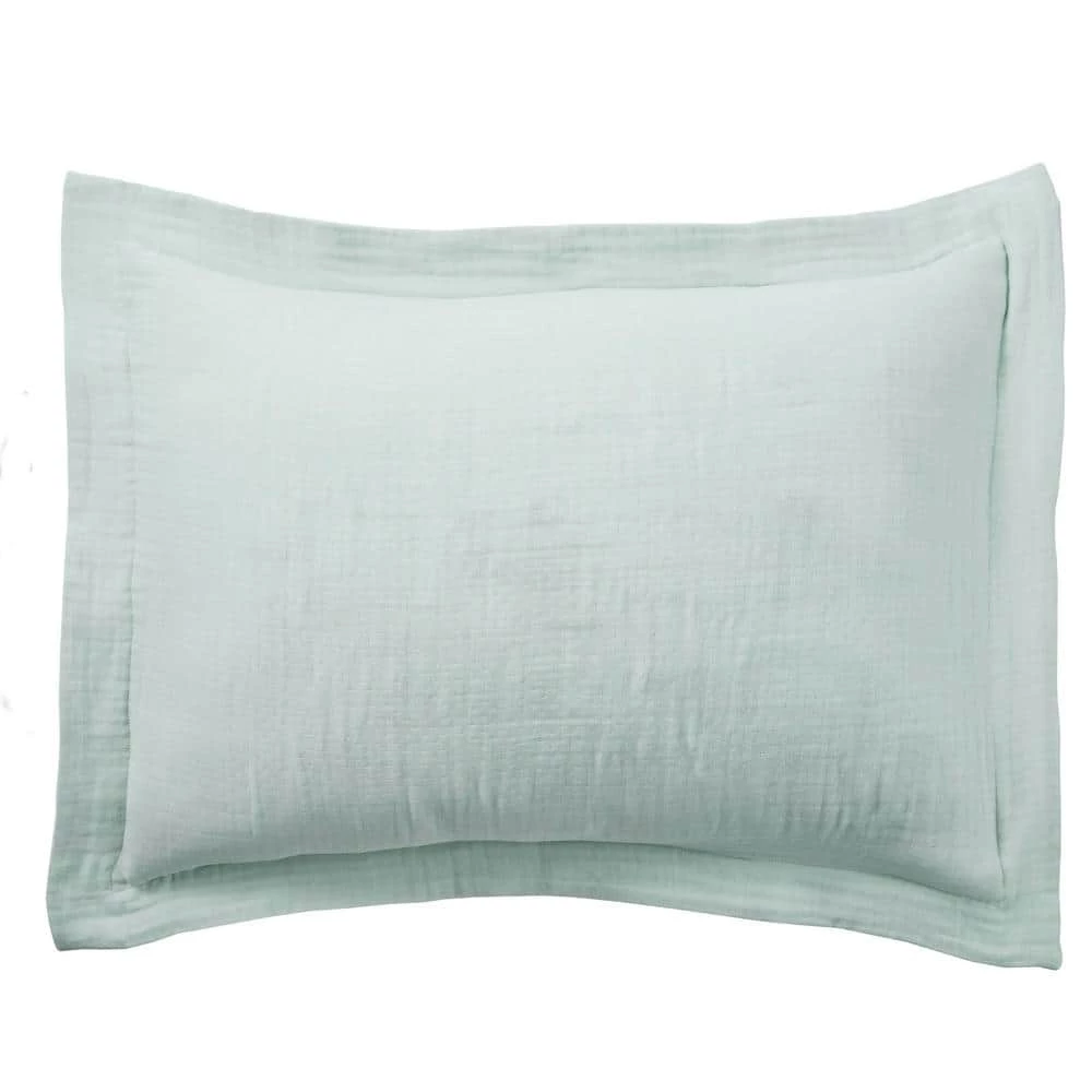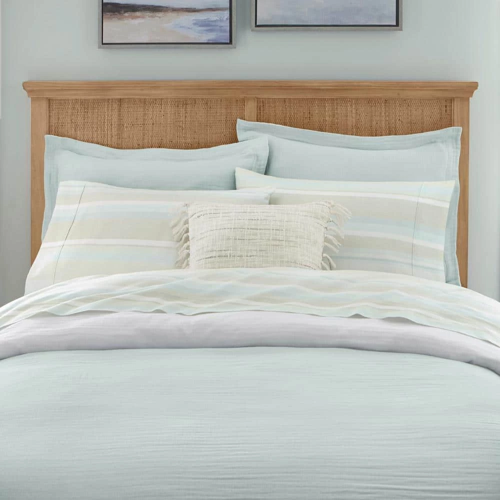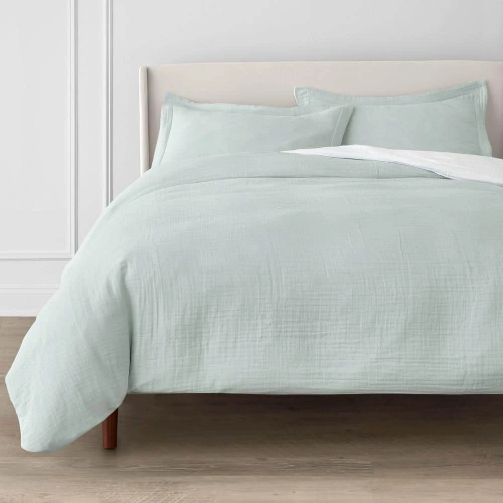 This Home Decorators Collection New Haven Reversible Sea Breeze Green Double Cloth Gauze Cotton Duvet Cover Set with soft, neutral blended tones will give your room a whole new character and cozy vibe. The double cloth gauze fabric of this duvet cover set features a truly soft touch and eye soothing textured look. A perfect fit for any season, this double cloth gauze duvet cover set is ultra lightweight, airy, and breathable. The sea breeze green duvet cover front also reverses to a solid white back for multiple different styling options. Made with 100% cotton for ultimate comfort, this luxury duvet cover set is stitched and finished to last lifelong. The button closure and corner ties keep your duvet insert or comforter in place without bunching. This 3-piece set includes one king duvet cover and two king shams, and its machine washable construction is effortless to maintain.