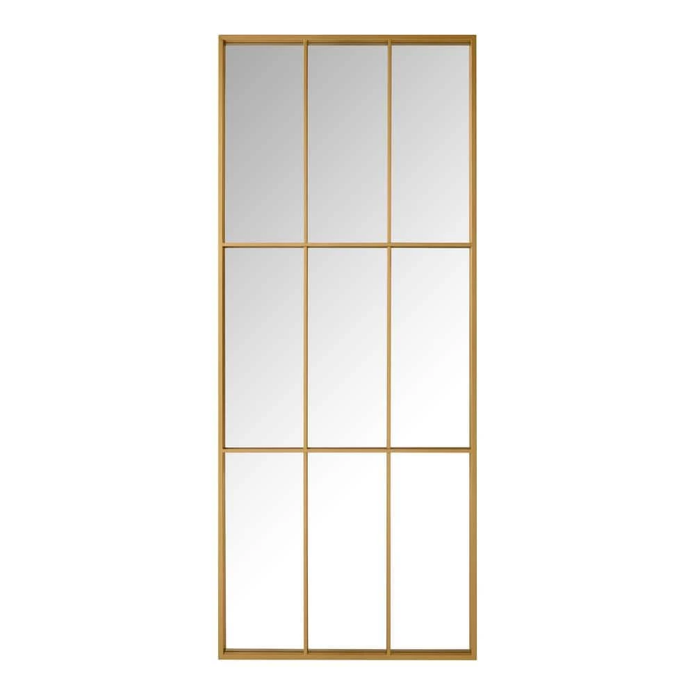 The Oversized Gold Metal Frame Windowpane Classic Floor Mirror from Home Decorators Collection features a sturdy metal frame with a gold finish that adds elegance to a classic-style decor. The large rectangular mirror can be added to any room to make it look larger, more spacious. It comes with key rings on the back for easy hanging. Use a soft cloth and standard glass cleaner to keep the mirror’s surface clean.