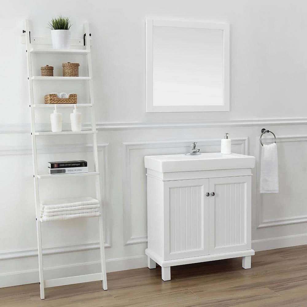 Cozy cottage style meets contemporary in the Parkbridge 30 in. vanity by Home Decorator’s Collection. Its classic white finish, beadboard paneled cabinet doors, modern countertop with integrated sink and sleek footed base is a timeless choice for any bathroom remodel. Pair with the Parkbridge white mirror for the perfect finishing touch.