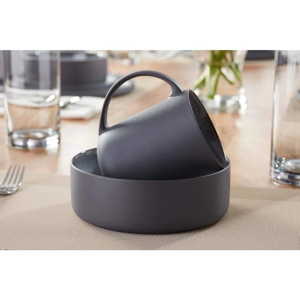 Enhance your dining experience with this Pierce 16-piece stoneware dinnerware set. With service for four people, you can use it everyday. This dishwasher and microwave safe set comes with four dinner plates, four salad plates, four cereal bowls, four fruit bowls and four dipping bowls. The rimmed shape and soft, dark grays give it a contemporary look.