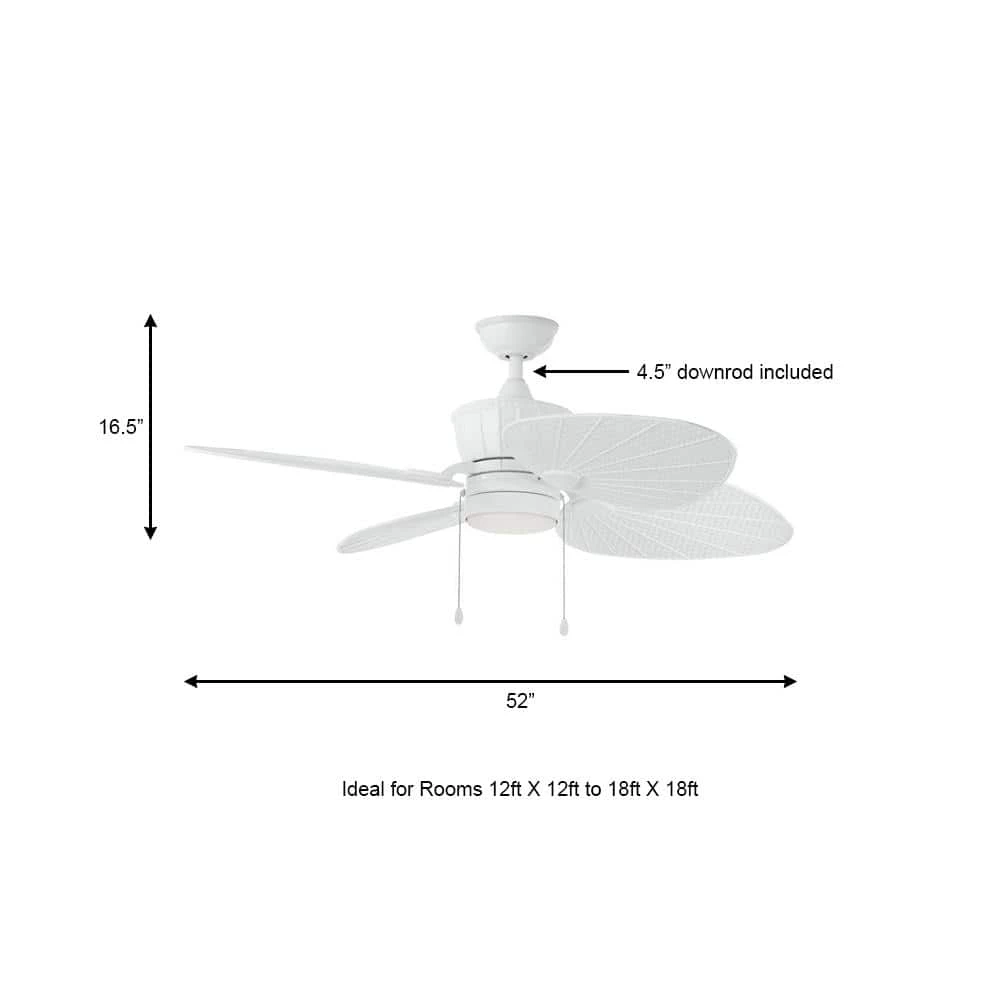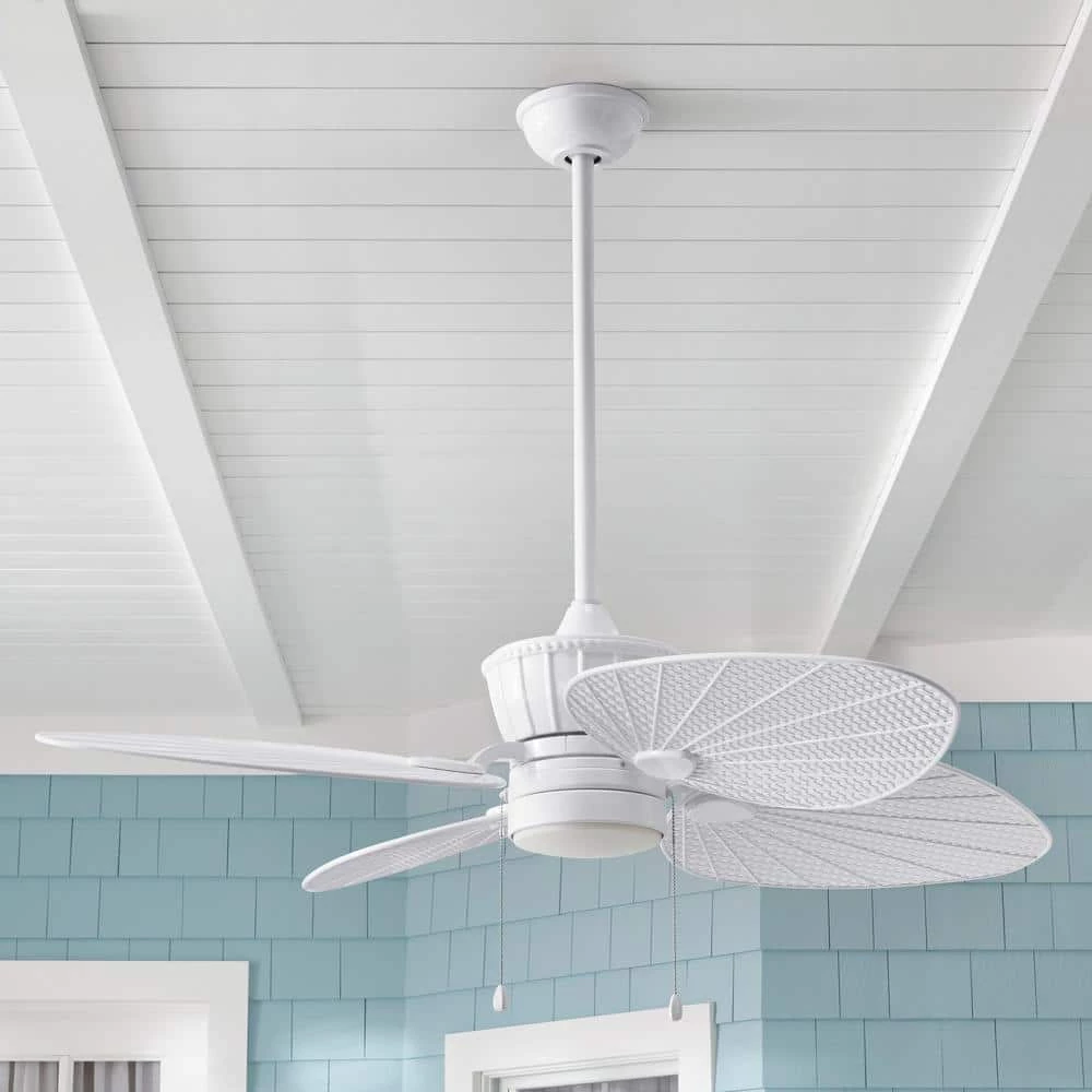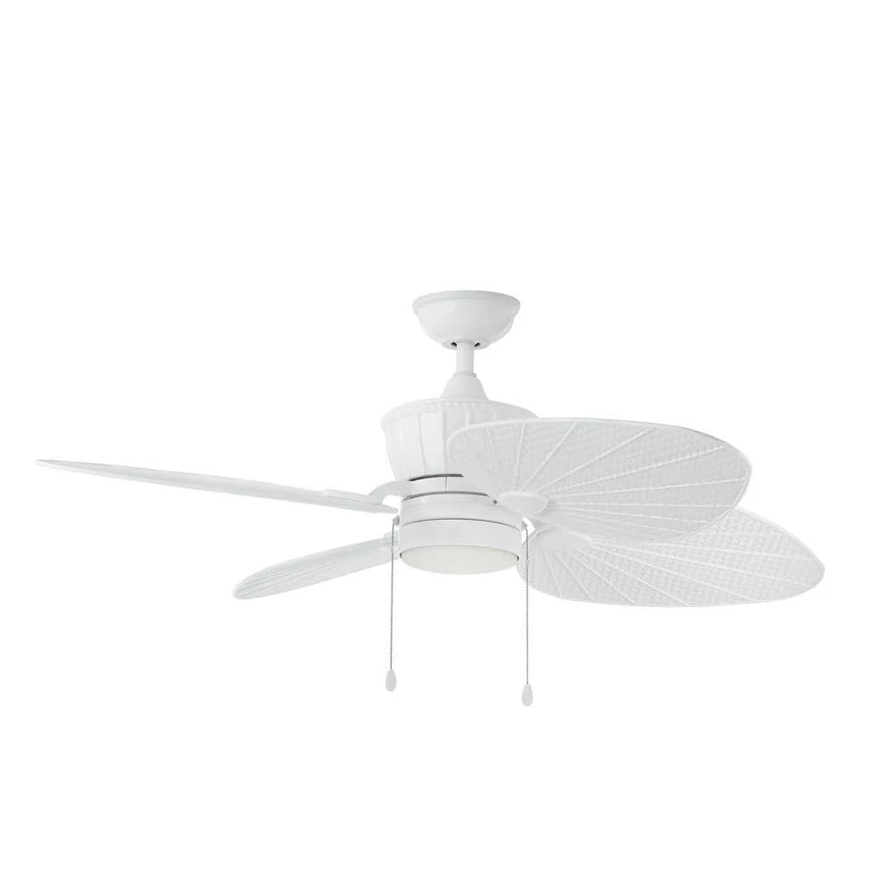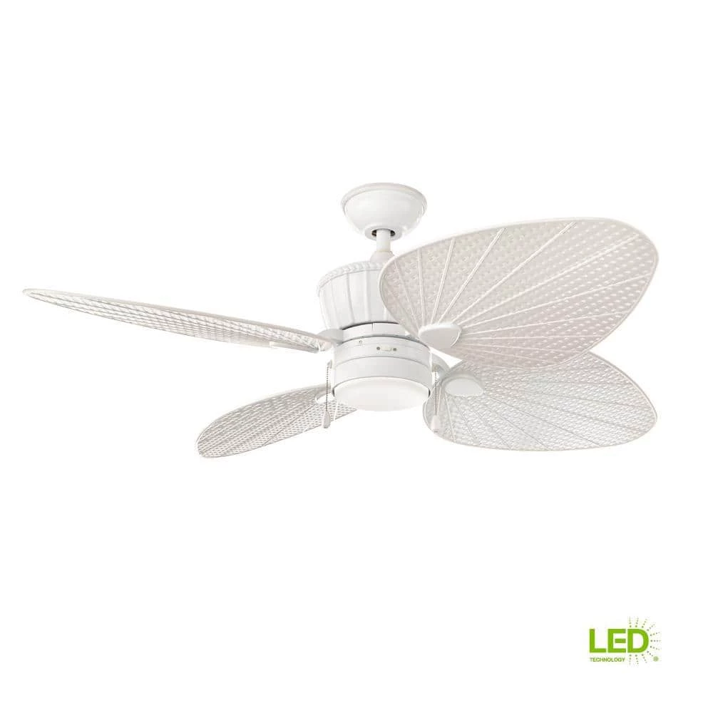 The Home Decorators Collection Pompeo 52 in. Indoor/Outdoor White Ceiling fan will turn your outdoor area into a tropical setting with its large leaf pedal blades and matching housing. The 18-Watt LED light kit will provide both sufficient light and great energy savings, plus has 3 light brightness settings. Also this fan is wet rated so it can be installed on an uncovered ceiling such as a pergola.