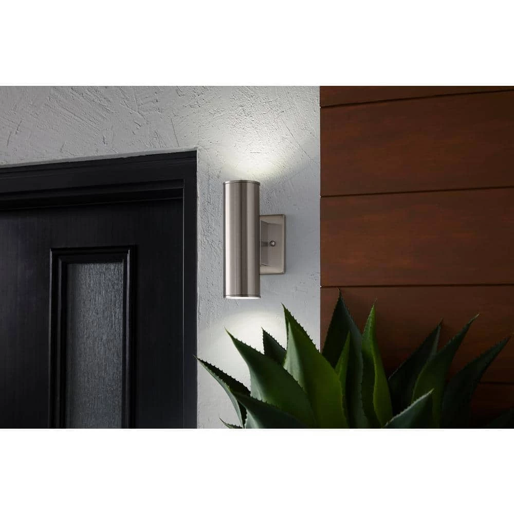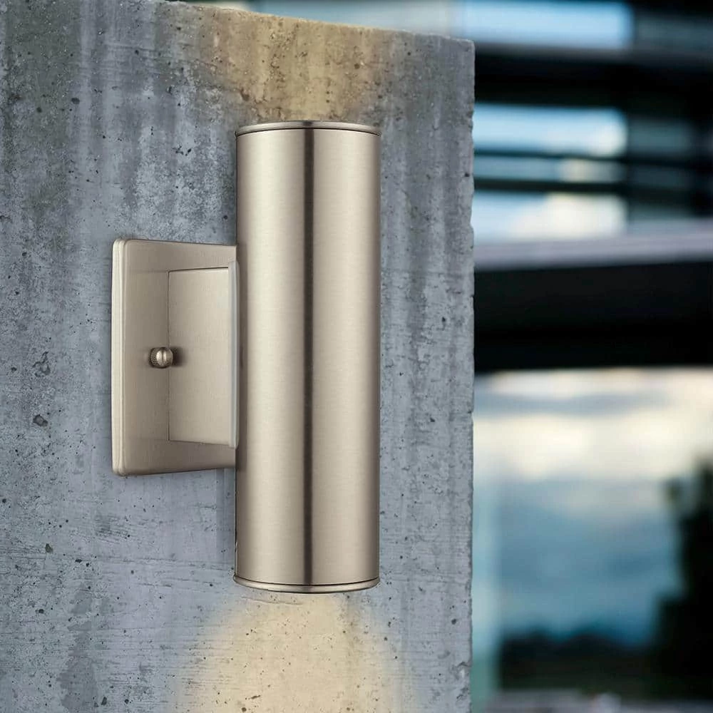 This Riga Wall-Mount 2-Light Outdoor Stainless-Steel Light Fixture mounts to an exterior wall to help illuminate your driveway, yard or patio. Its sleek style and stainless-steel finish add a modern touch to your outdoor decor. The light fixture is weather resistant to help provide long-lasting use and is UL listed for safety.