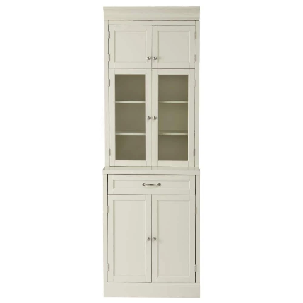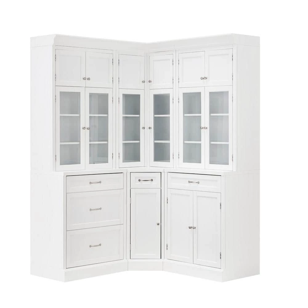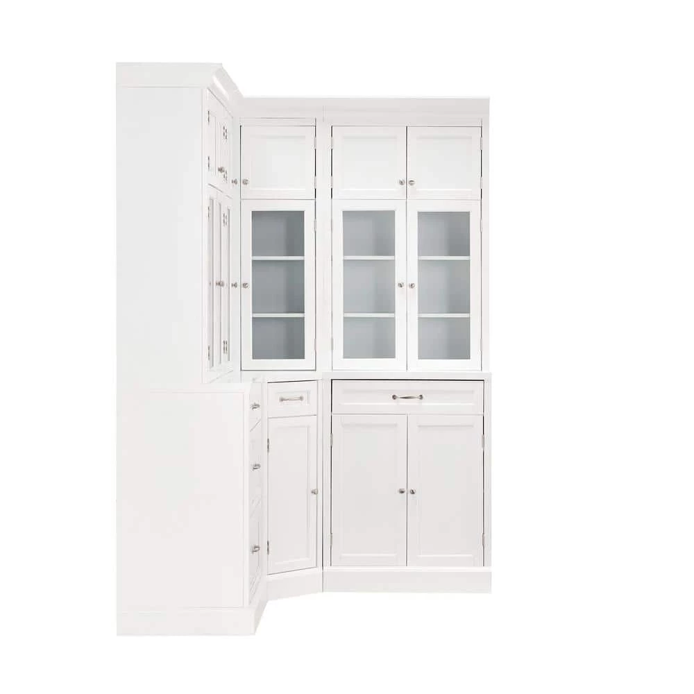 The Royce Modular Collection from Home Decorators Collection offers an easy way to create your perfect kitchen pantry without a costly remodel. All items in this collection boast generous crown molding, raised panels, a fresh true white finish and zinc hardware in a bronze finish. Each piece also features closed cubby-height cabinets above generous glass-door cabinets. Two of the pieces are standard freestanding cabinets; the third is a corner unit. This piece, the 1-Drawer Modular Storage Cabinet, is one of the standard cabinets. It features a wide top drawer and a large two-door cabinet with an adjustable interior shelf. The two shelves behind the glass doors are also adjustable, allowing you to customize shelf height to your kitchenware. Show off dishes and glassware while keeping pots, pans and small appliances out of sight with this versatile cabinet.