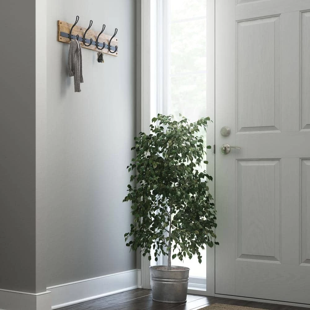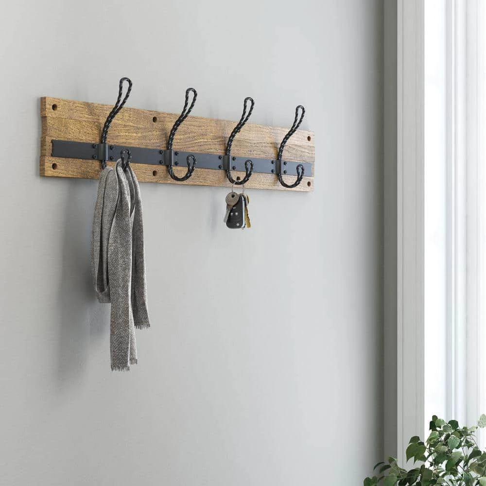 This 27 in. Rustic Pine and Matte Black Hook Rack makes a great addition for your organization needs. The 4 hooks can hold your coats, hats, handbags, bookbags, robes and towels. This hook rack perfectly complements a casual home decor style.
