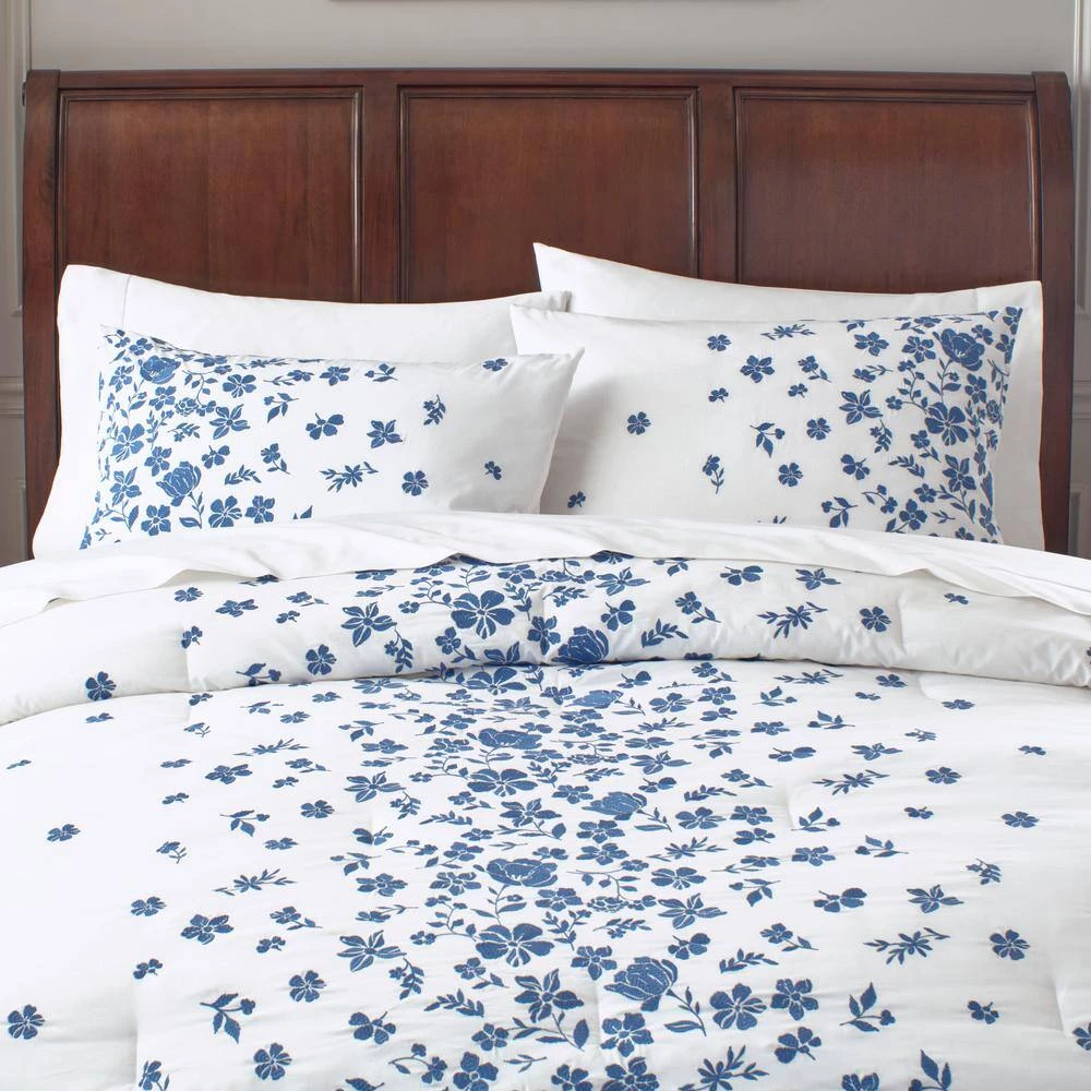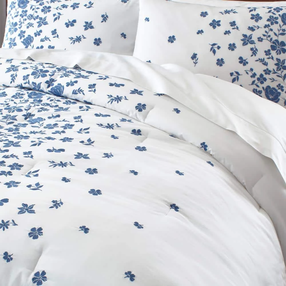 Update your master or guest room with the sweet and stylish Home Decorators Collection Salina White and Blue Embroidered Floral Cotton Comforter Set. The beautiful blue floral details are embroidered over a white background for a lovely textured look. Two standard pillow shams and an ample comforter make it easy to set up your guest room or master bed, and the machine washable construction is effortless to maintain. Made from a 100% cotton shell, this comforter set is soft to the touch and breathable for a great night’s sleep.