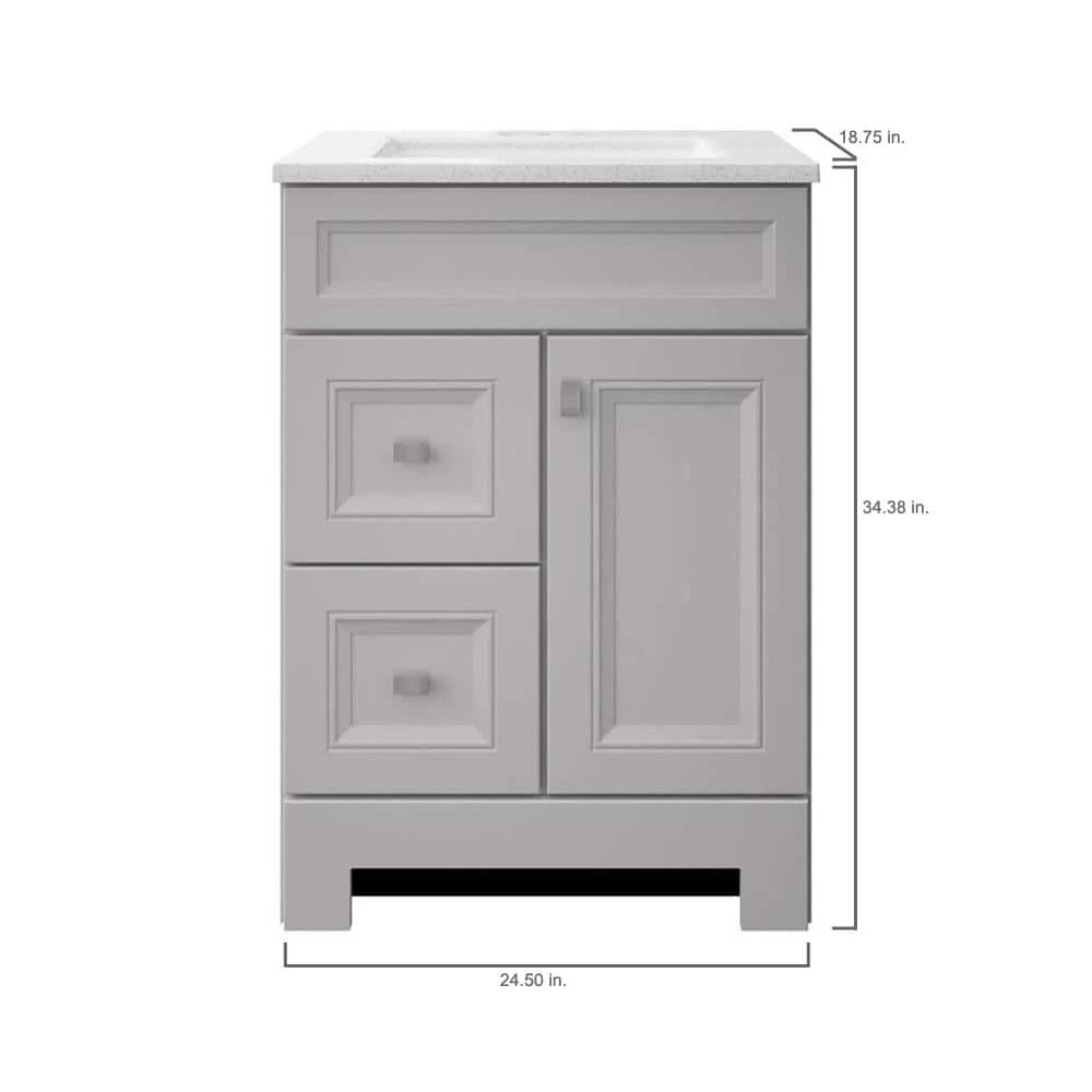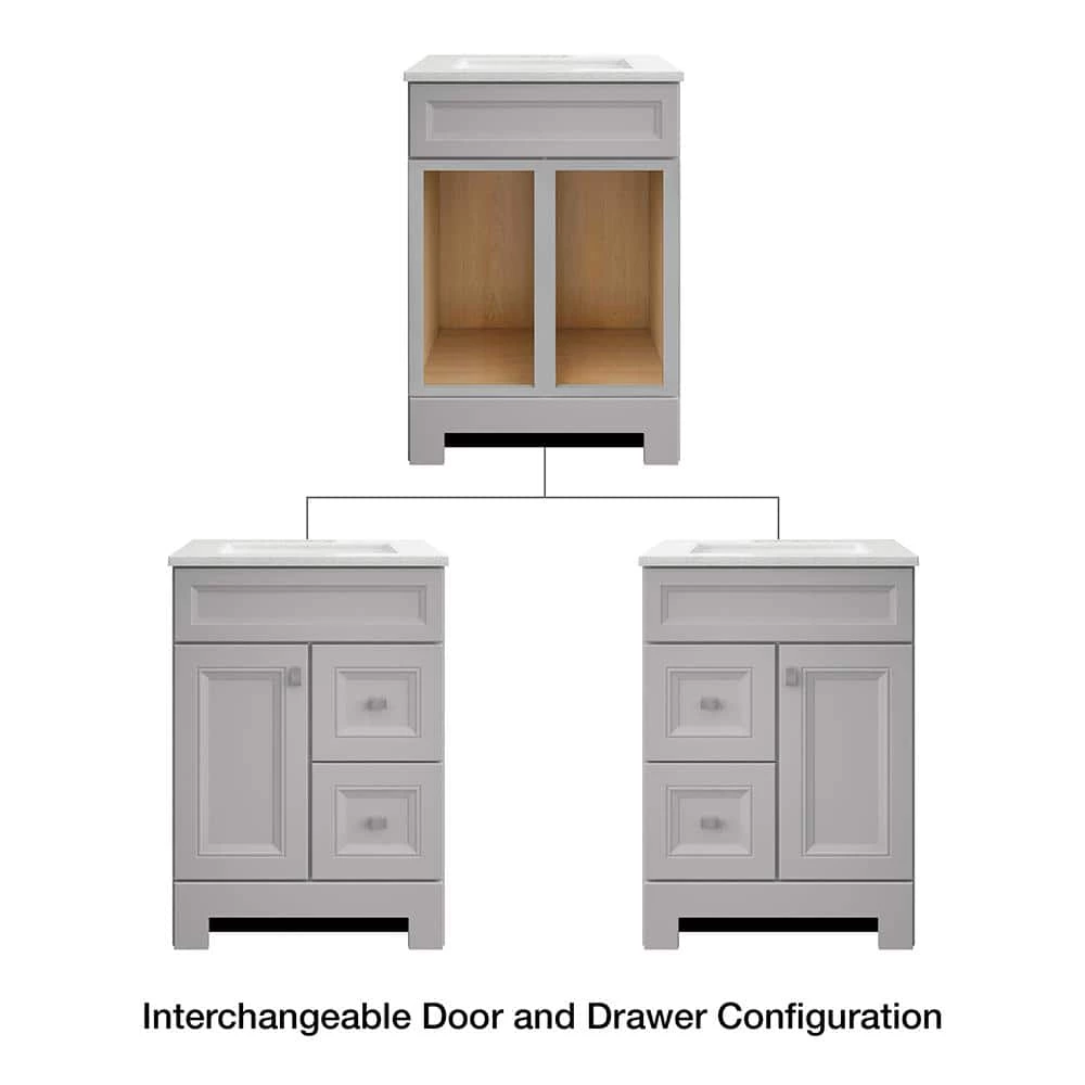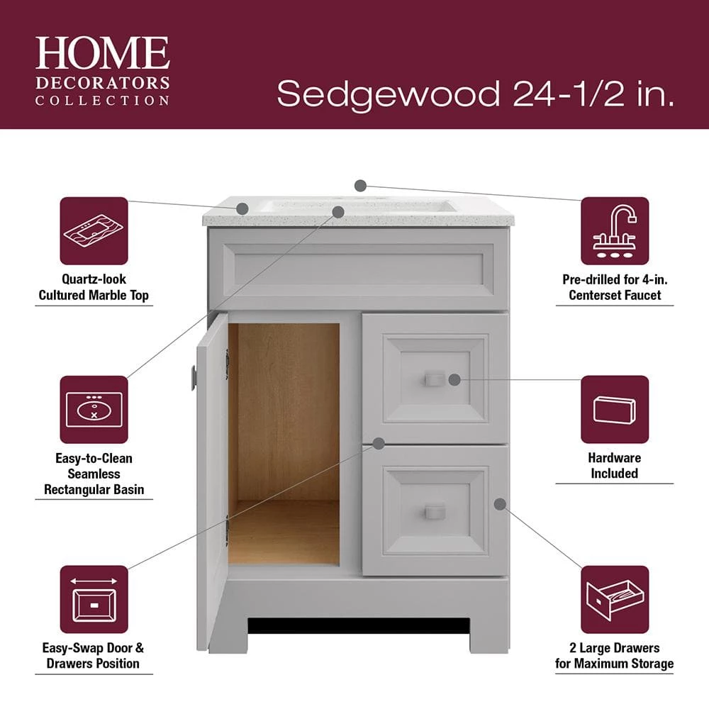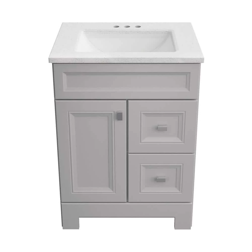 The 24 in. W Sedgewood Vanity in Dove Gray with Solid Surface Technology Vanity Top in Arctic from Home Decorators Collection has a compact size, making it an ideal choice for a small bathroom. Stylish and attractive with traditional raised panel doors, this vanity has a durable dove gray finish, an arctic solid surface technology vanity top with white bowl, a decorative toe kick and brushed nickel hardware. Additionally, the drawers and door can be swapped to be on the left or right. Pre-drilled for a 4 in. center set faucet, this vanity will provide ample storage and has a maple finished interior that is easy to clean.