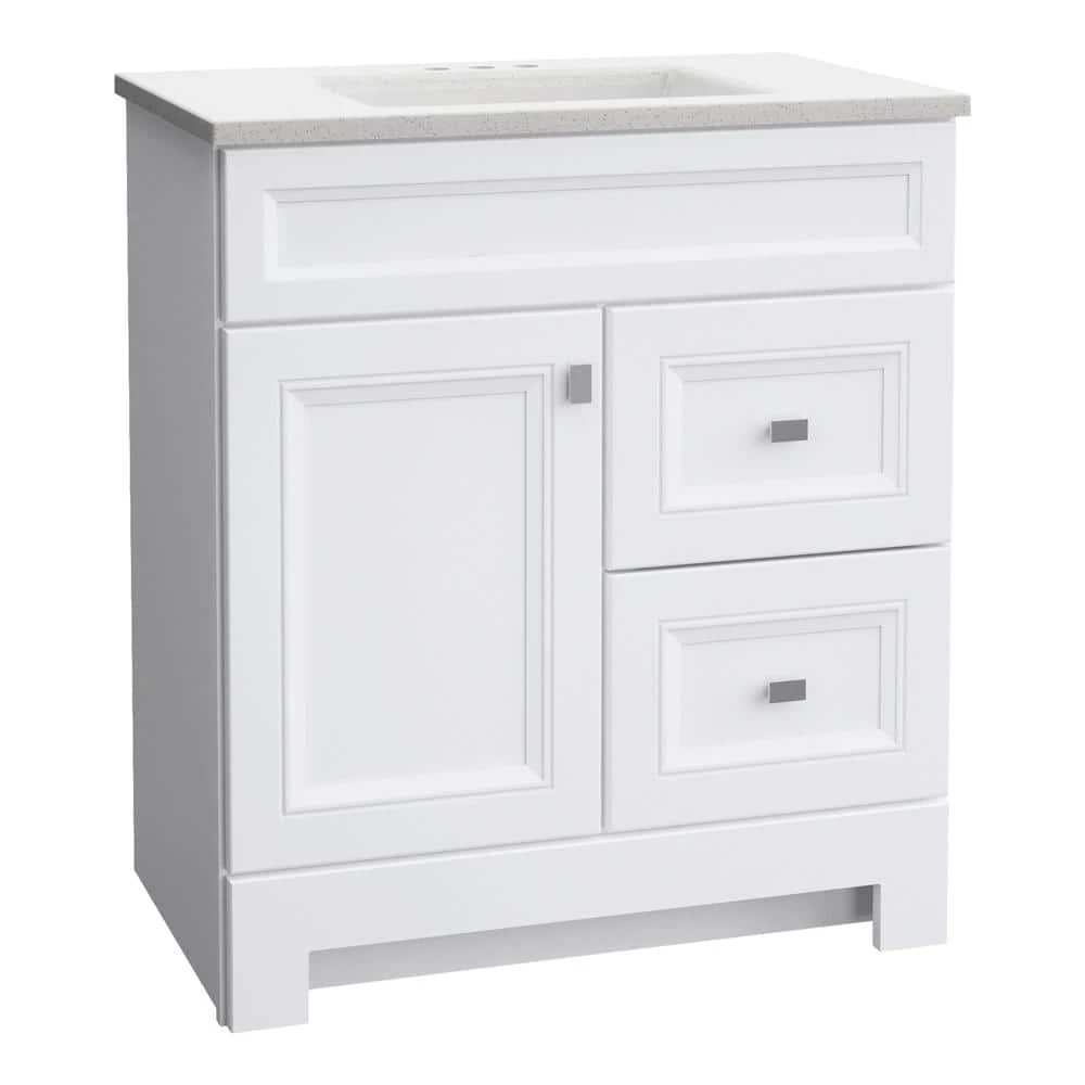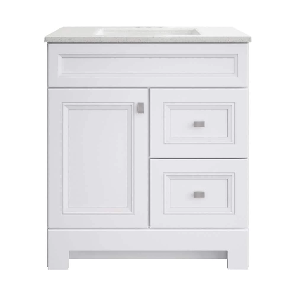 The 30 in. W Sedgewood Vanity in White with Solid Surface Technology Vanity Top in Arctic from Home Decorators Collection has a compact size, making it an ideal choice for a small bathroom. Stylish and attractive with traditional raised panel doors, this vanity has a white finish, a durable arctic solid surface technology vanity top with white bowl, a decorative toe kick and brushed nickel hardware. Additionally, the drawers and door can be swapped to be on the left or right. Pre-drilled for a 4 in. center set faucet, this vanity will provide ample storage and has a maple finished interior that is easy to clean.