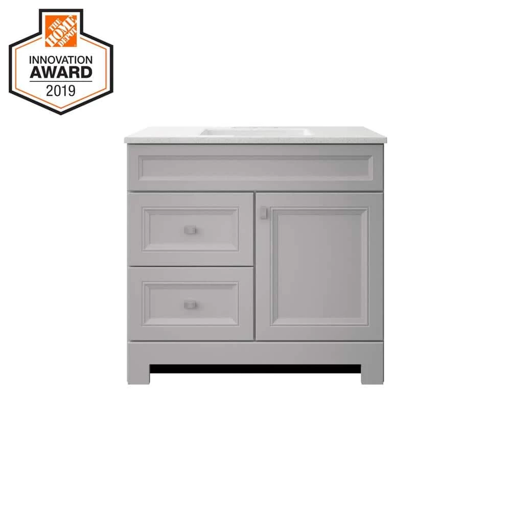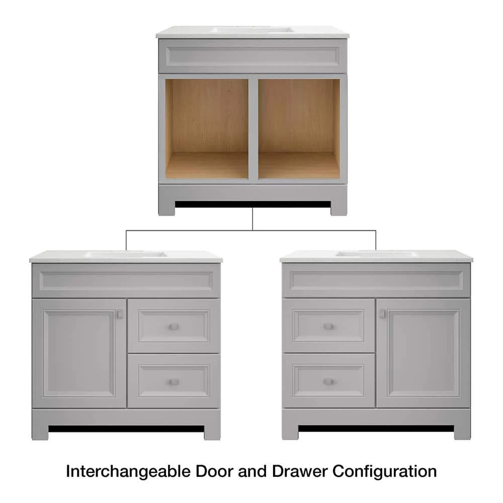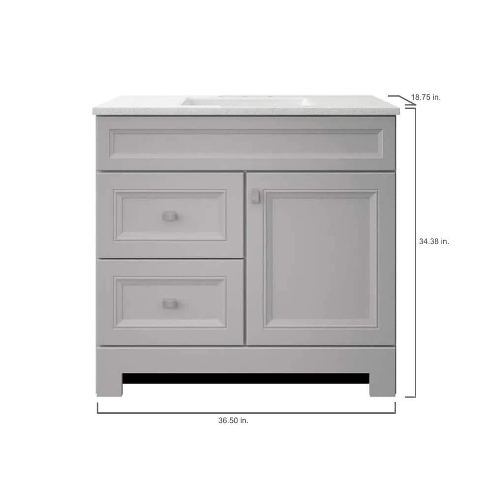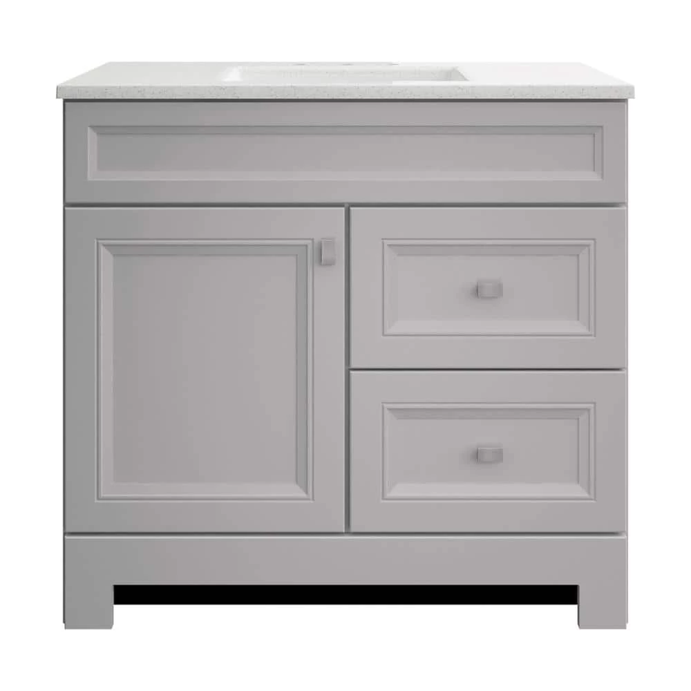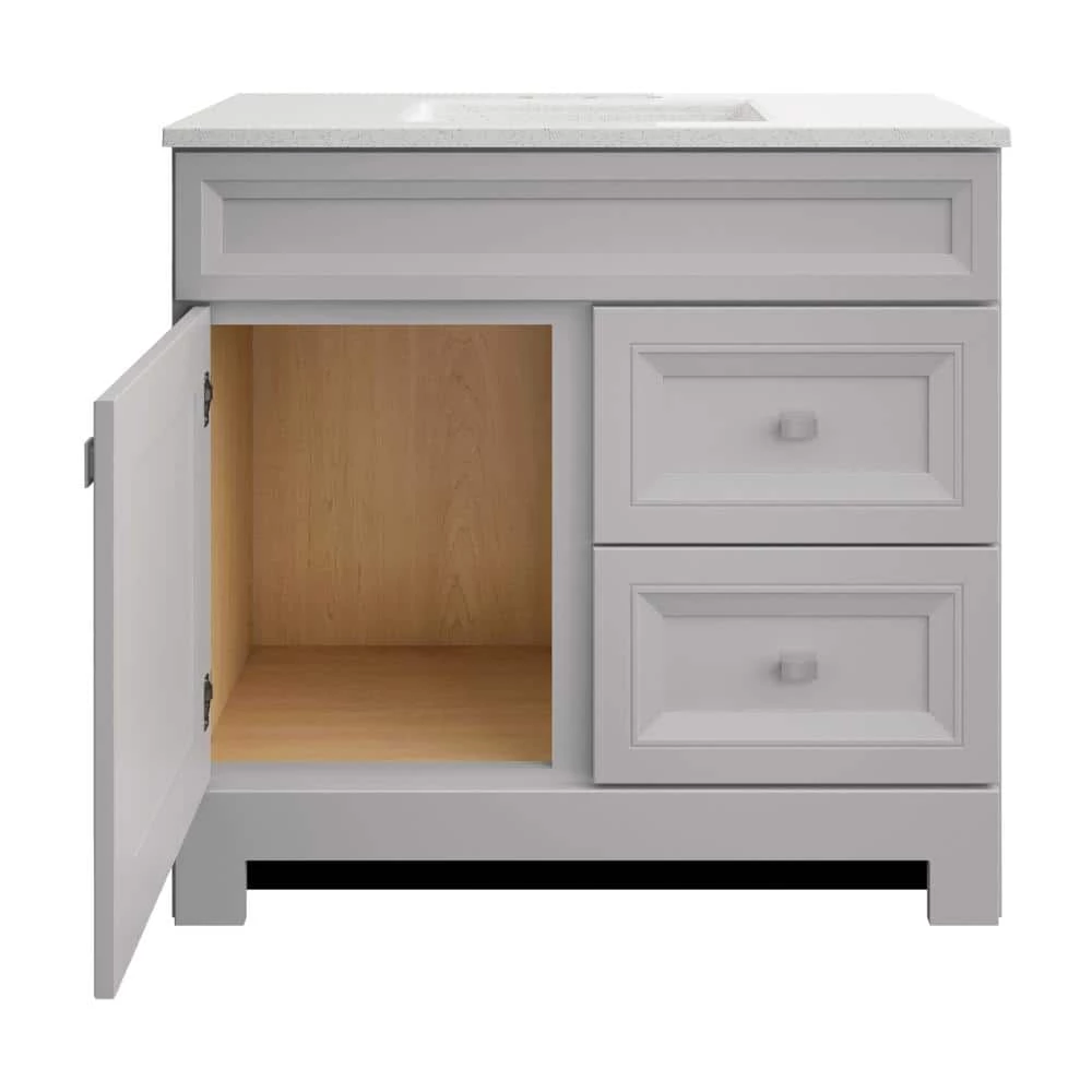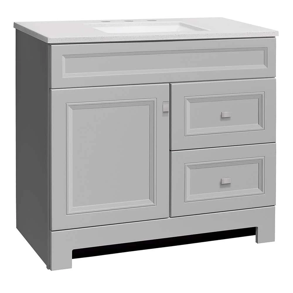 The 36.5 in. W Sedgewood Vanity in Dove Gray with Solid Surface Technology Vanity Top in Arctic from Home Decorators Collection is an ideal choice a replacement bathroom vanity cabinet. Stylish and attractive with traditional raised panel doors, this vanity has a dove gray finish, a durable arctic solid surface technology vanity top with white bowl, a decorative toe kick and brushed nickel hardware. Additionally, the drawers and door can be swapped to be on the left or right. Pre-drilled for a 8 in. widespread faucet, this vanity will provide ample storage and has a maple finished interior that is easy to clean.