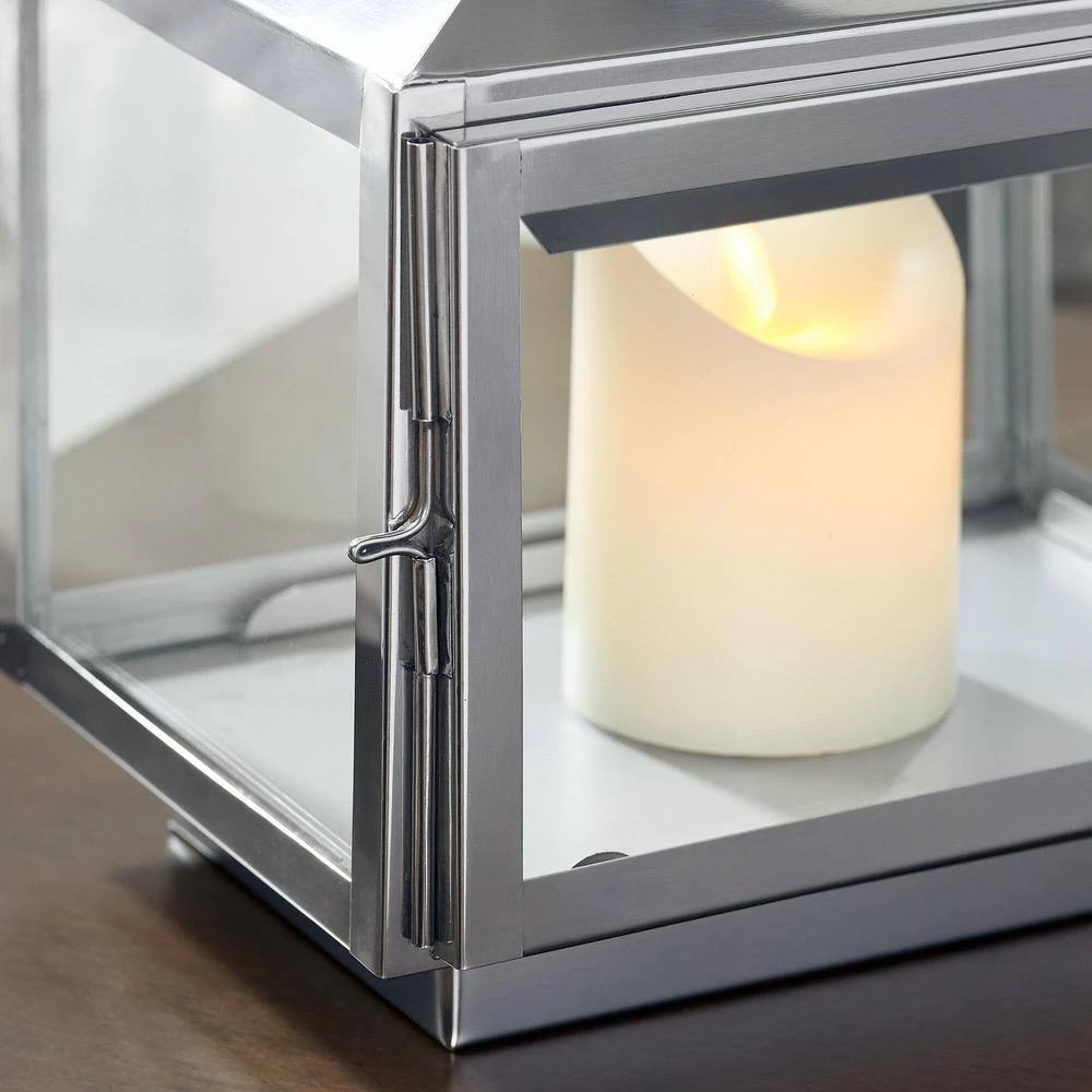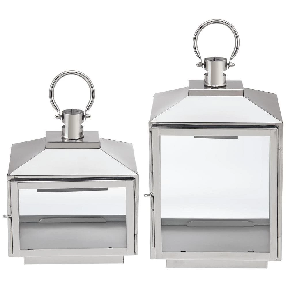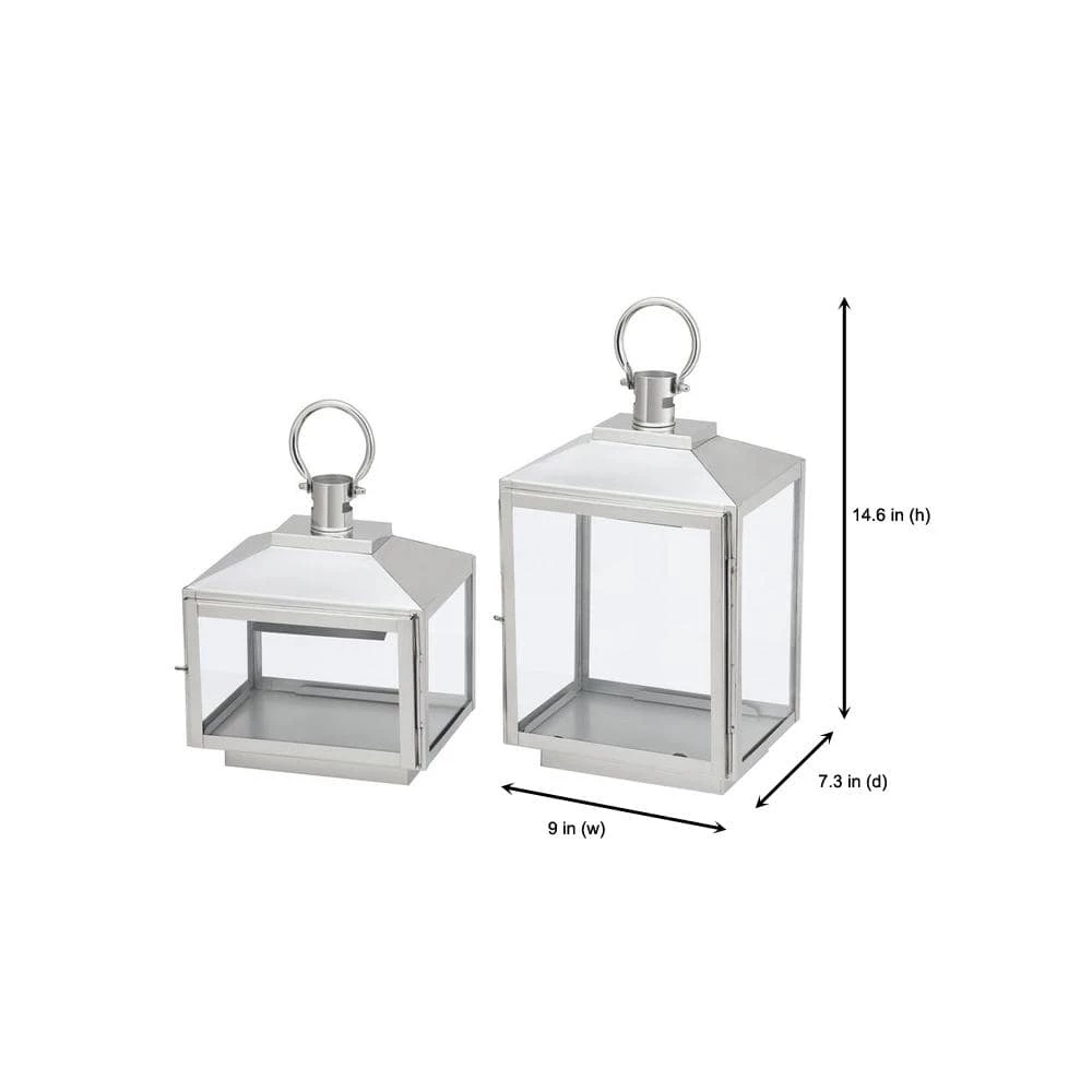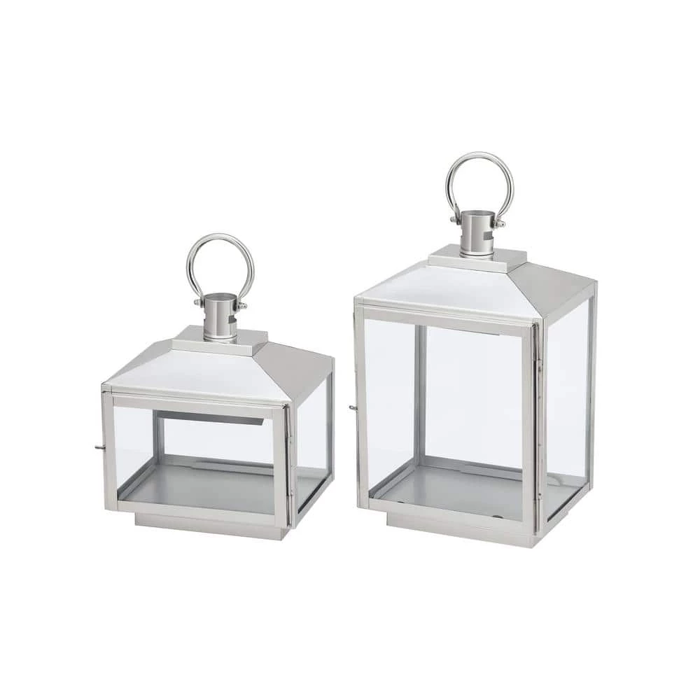 Enhance your indoor living area with this set of stainless steel hanging or tabletop lanterns. Made for flameless candles, they offer a glass and metal design that complements a living room, entryway and more. A handle at the top makes them easy to move, and the door hinges allow easy placement. The silver finish and two sizes create decorative charm.
