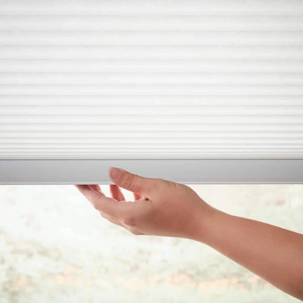 The Home Decorators Collection Snow Drift White Top Down Bottom Up Light Filtering Cellular Shade is a versatile window covering that provides the ability to raise the shade from the top or lower it from the bottom, offering greater flexibility in light and privacy control. The cellular shade has a honeycomb construction creates air chambers that insulate and shield your room from the outside heat or cold, helping lower your heating or cooling bills all year round. The cordless shade’s honeycomb-shaped cells are made with durable, spun lace fabric that forms crisp, clean pleats on the shade that keep your windows looking sleek.
