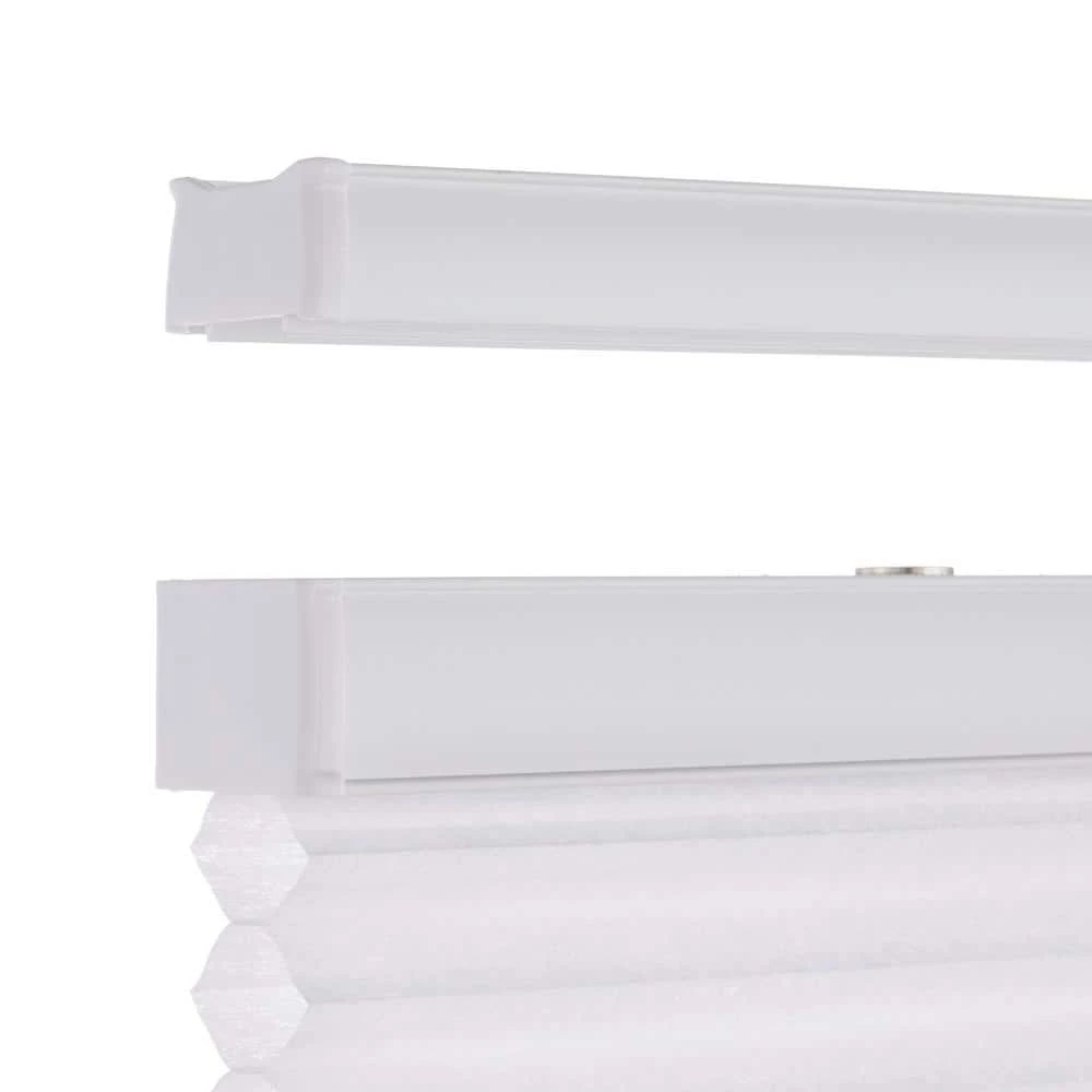 - Color coordinated vinyl head rail matches the cellular shade’s white finish