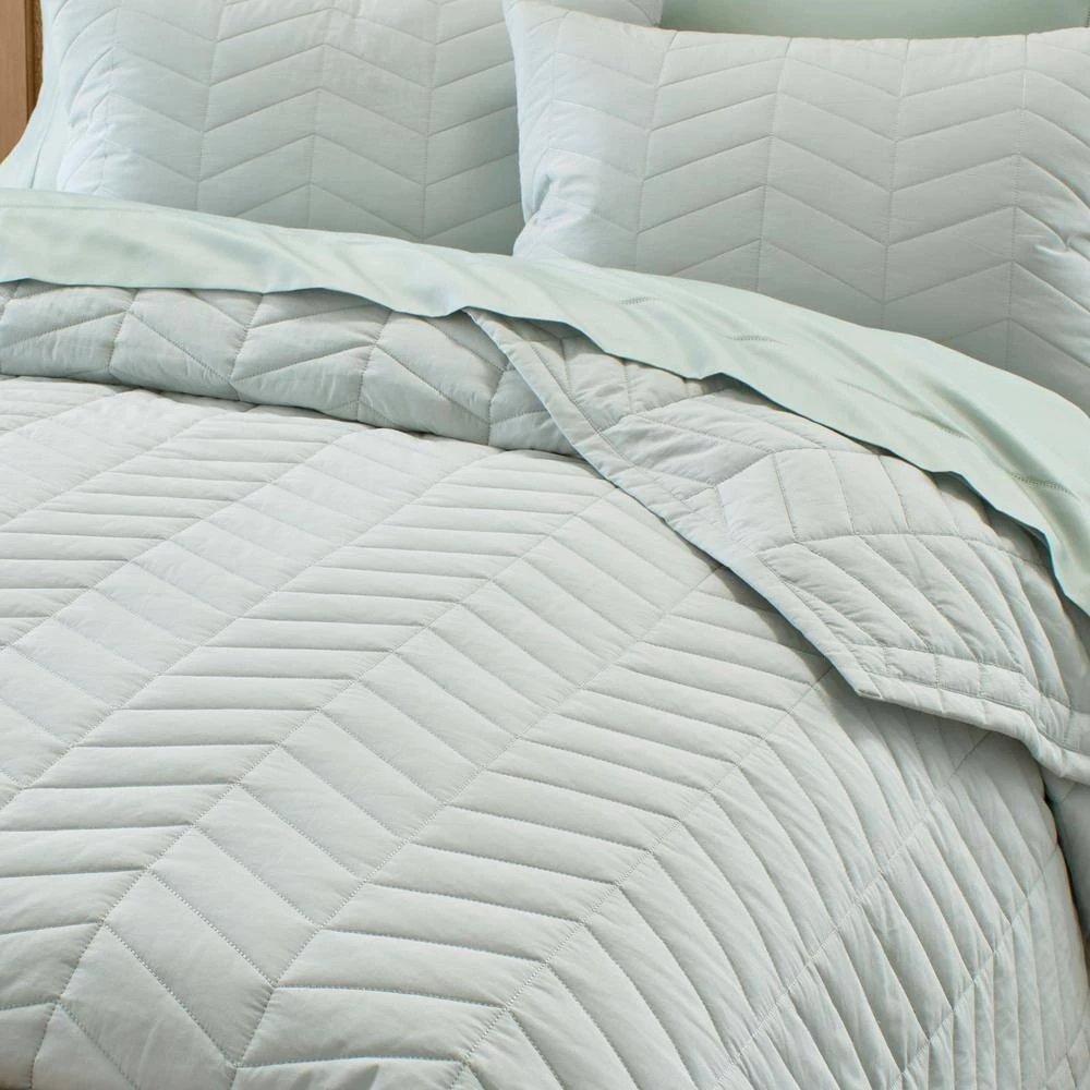 Refresh your restful retreat with this Home Decorators Collection Spring Hill Sea Breeze Green Diamond Cotton Quilt Set. Bringing coastal and summery vibes, this light green quilt set features a diamond quilted design that creates a classic, timeless look for your room. Being ultra lightweight, this quilt set is perfect for those who tend to sleep hot but still enjoy the cozy feeling of bedding. This diamond quilt set can also easily work layered in between a comforter or duvet cover for those who love to be bundled up at night, or for transitioning seasons. Two standard pillow shams and an ample comforter make it easy to set up your guest room or master bed, and the machine washable construction is effortless to maintain.