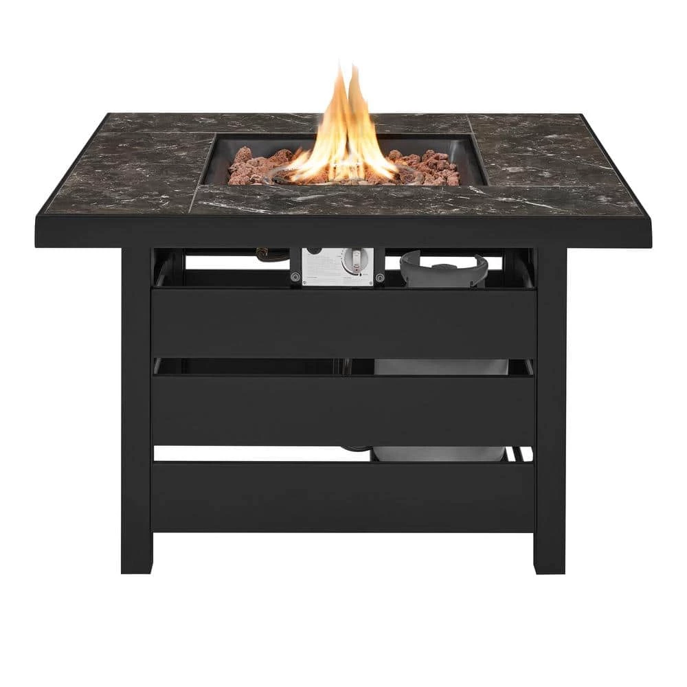 Add warmth, style and function to your outdoor space with this Summerfield gas fire pit. The black marble tile top offers a beautiful upscale look to dress up your outdoor space. With 10 inches of mantel on all four sides of the fire bowl, this 39.5 in. square gas fire pit offers plenty of tabletop space for dining and entertaining while gathered around the warm flames. Pairs well with dark color metal, wicker, or wood patio furniture.