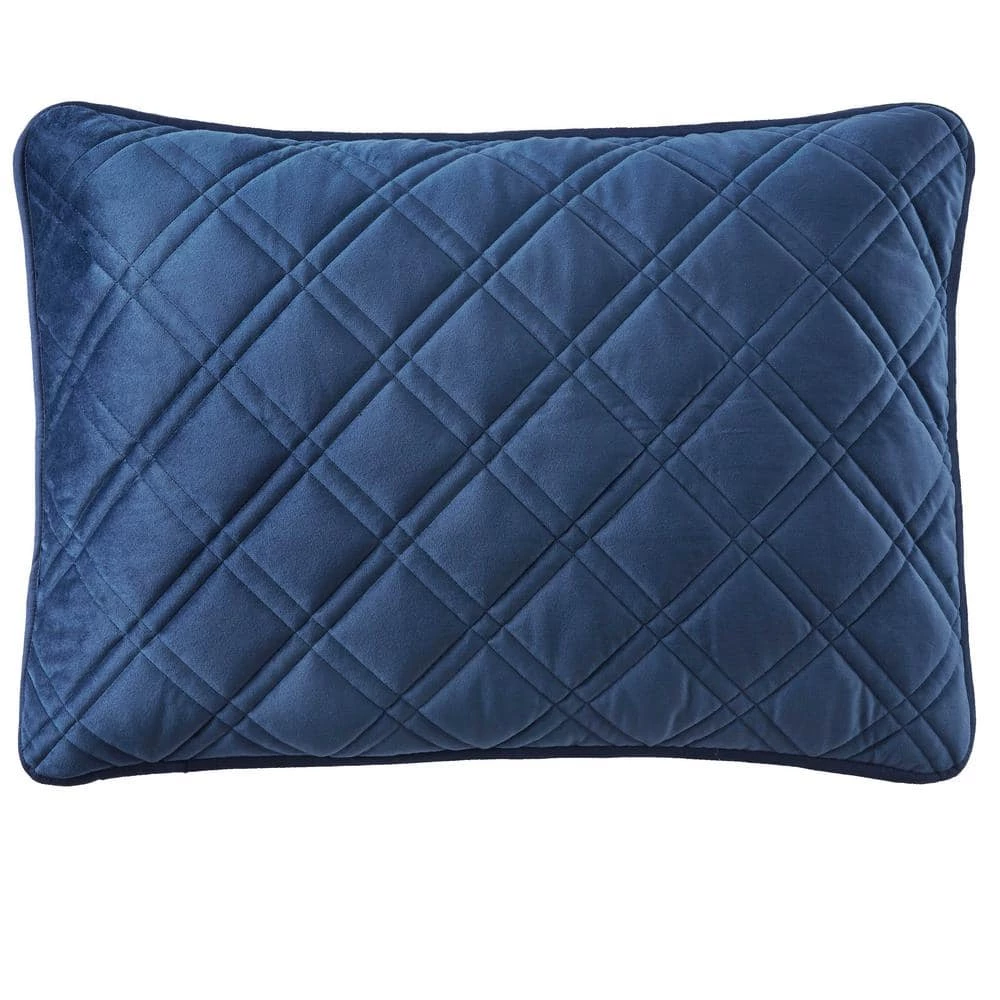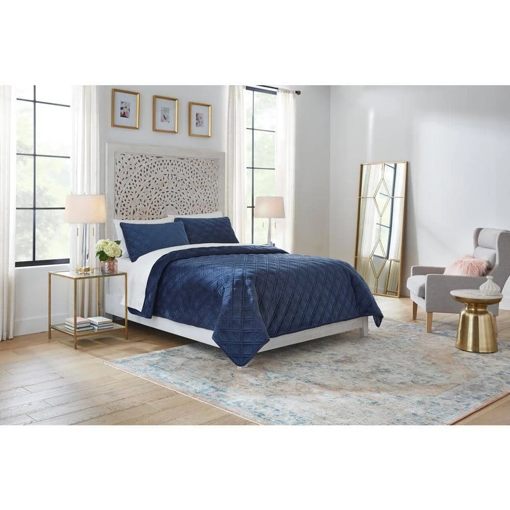 Bring ultimate luxury and glam to your bedroom with this Home Decorators Collection Sylvie 3-Piece Midnight Blue Velvet Quilt Set. Made of polyester velvet, this quilt will keep your bed ultra cozy and comfortable all year long. The soft velvet has been embroidered in a classic diamond pattern for added sophistication. Two standard pillow shams and a quilt make it easy to set up your guest room or master bed, and the machine washable construction is effortless to maintain. Certified STANDARD 100 by OEKO-TEX.