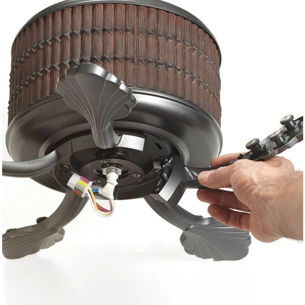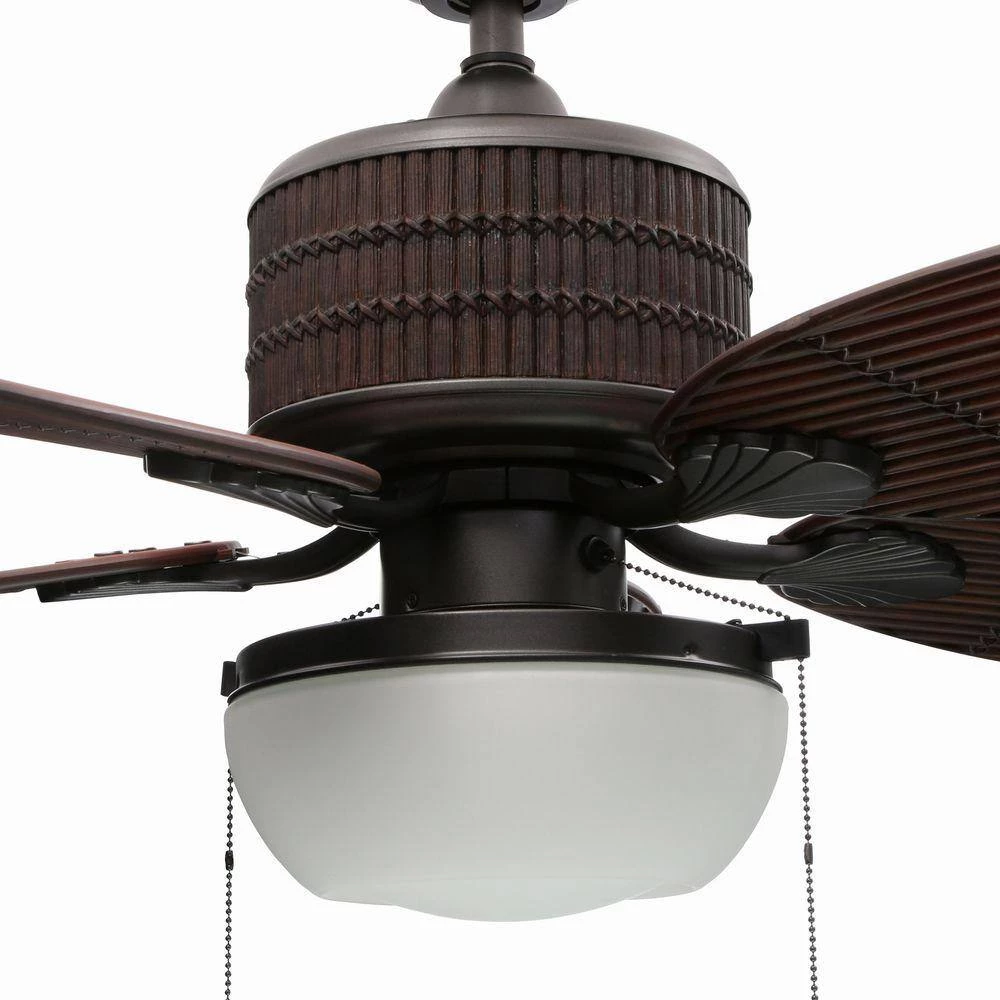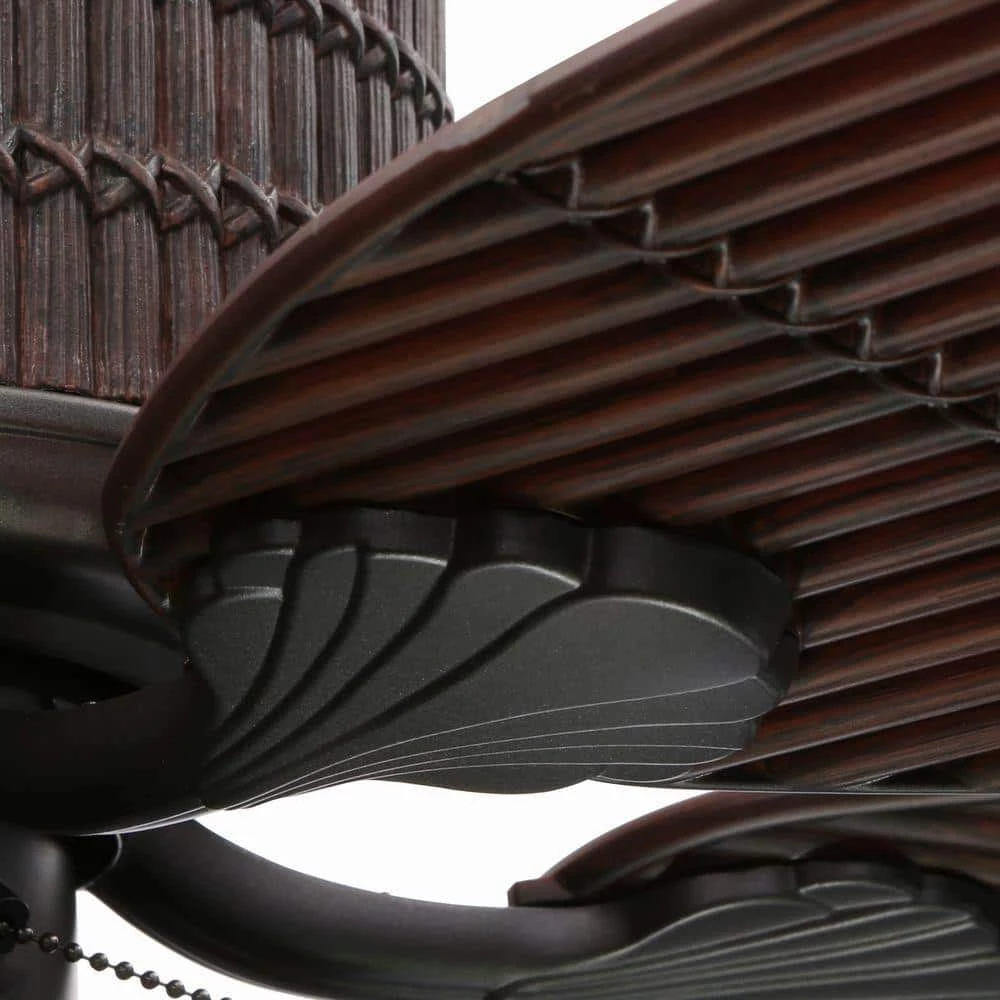 The Hampton Bay Tahiti Breeze 52 in. Indoor/Outdoor Natural Iron Ceiling Fan elicits a tropical feel with its beautiful bamboo styling and mahogany finish. This powerful 4,672 CFM fan refreshes outdoor spaces up to 20 ft. x 20 ft. and features 3-speed variable pull-chain control. Its blades are weather resistant, and its housing is wet-rated for durability in open applications. An integral dome-style light kit provides bright illumination from the included and efficient 9-watt LED bulbs. A decorative canopy ring and coupling cover conceal installation screws for a clean and finished look.