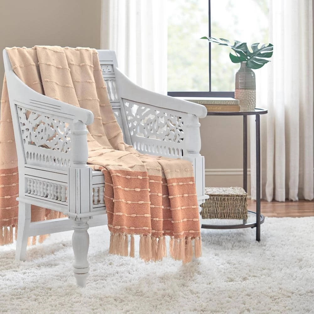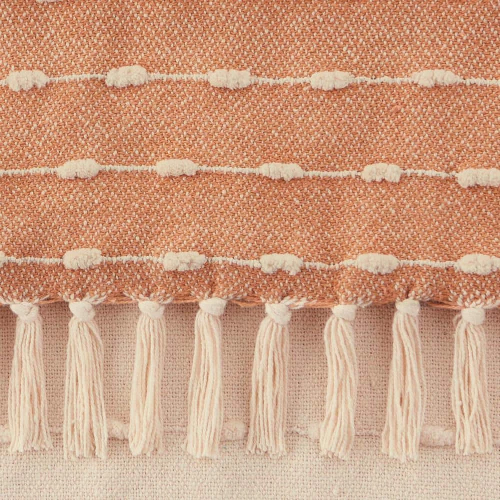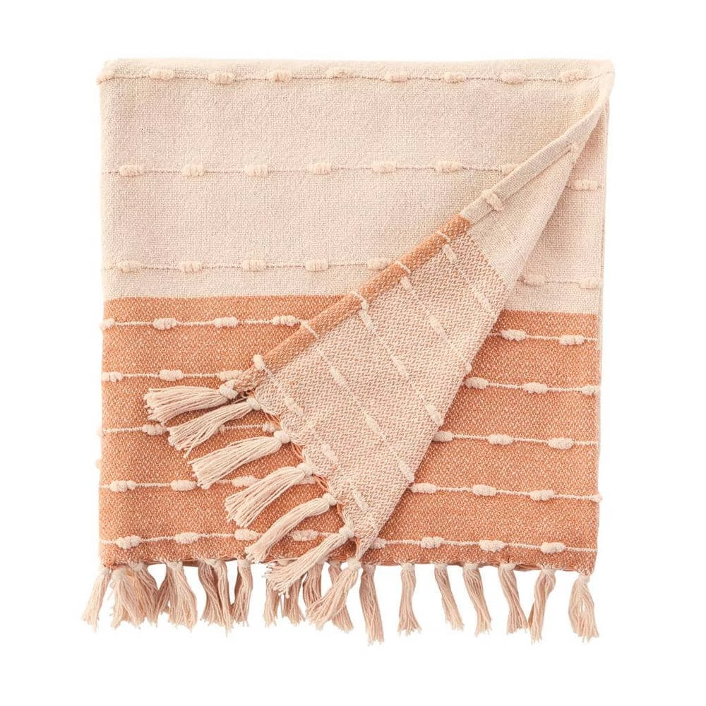 Combine cozy comfort and style with this Home Decorators Collection Terracotta Border Stripe Turkish Cotton Woven Throw Blanket with Fringe. Crafted from soft and breathable cotton, this woven throw blanket is the perfect addition to a chilly night or even a cool summer evening. Drape this terracotta boho throw blanket over the back of a chair, your couch, or your bed to easily grab when cozying up to watch your favorite show or reading a good book. The knotted fringe will add a stylish look to your space, and the soft material will provide a cozy feel for ultimate relaxation. This terracotta stripe woven throw blanket measures 50 in. wide x 70 in. long. Our woven Turkish cotton throw blanket is durable for year-round use and machine washable for easy care. Certified Standard 100 by OEKO-TEX.