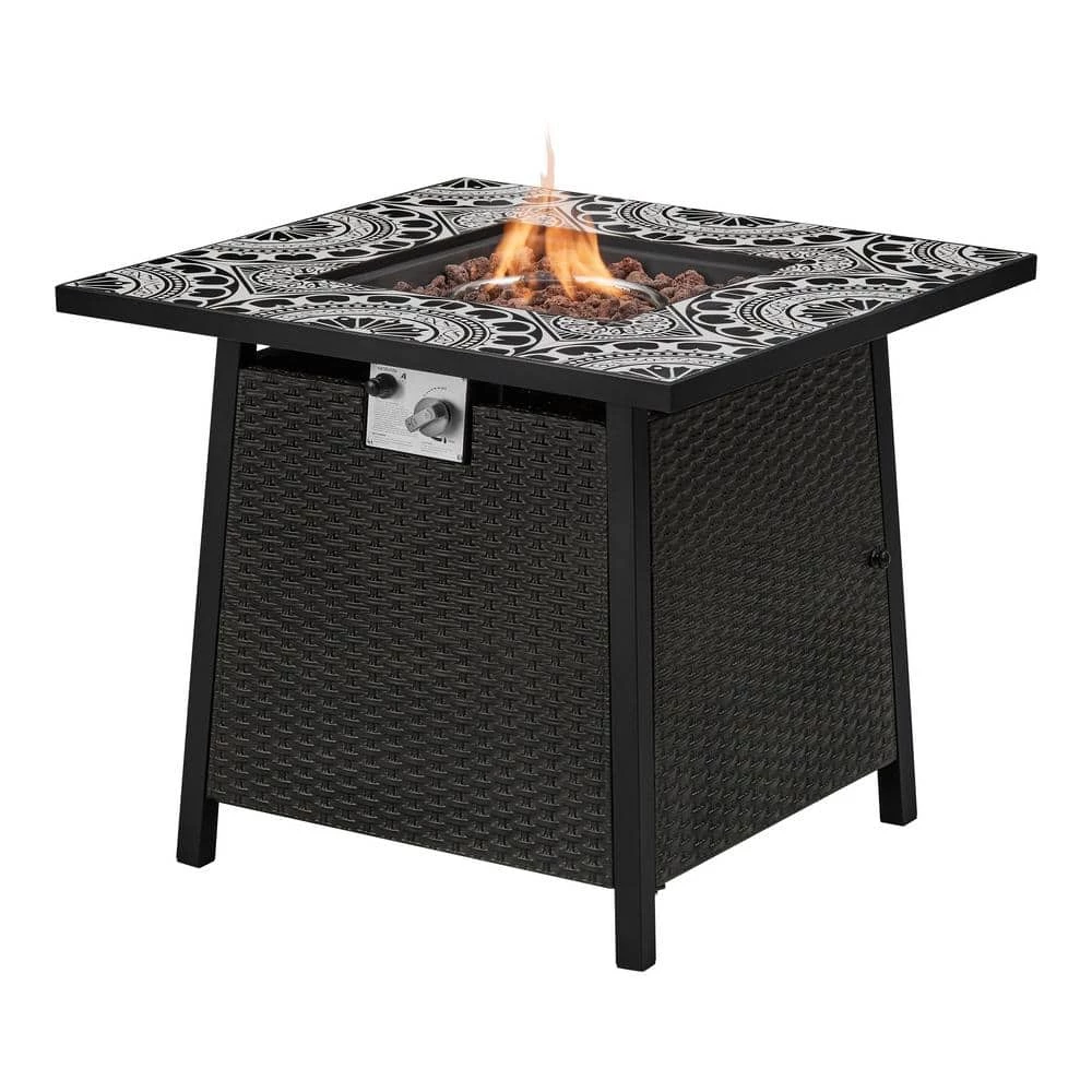 Featuring durable tile and metal construction with unique metal stamped wicker sides, this Tucson fire pit table creates a comfortable and stylish gathering space for outdoor entertainment. It is heat, scratch, weather, and rust-resistant so you can enjoy many seasons of worry-free lounging. The ceramic tile top creates a beautiful fire table that will fit a variety of decor styles. The tile on this fire table is the same tile used on the Marivaux 5 pc dining set. Pair the two together for a coordinated look. With 7 ½ inches of mantel around the fire bowl, this 30 in. square gas fire pit offers plenty of tabletop space for dining and entertaining while gathered around the warm flames. Pairs well with dark color metal, wicker, or wood patio furniture.