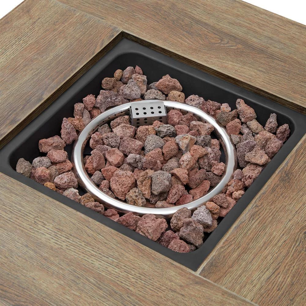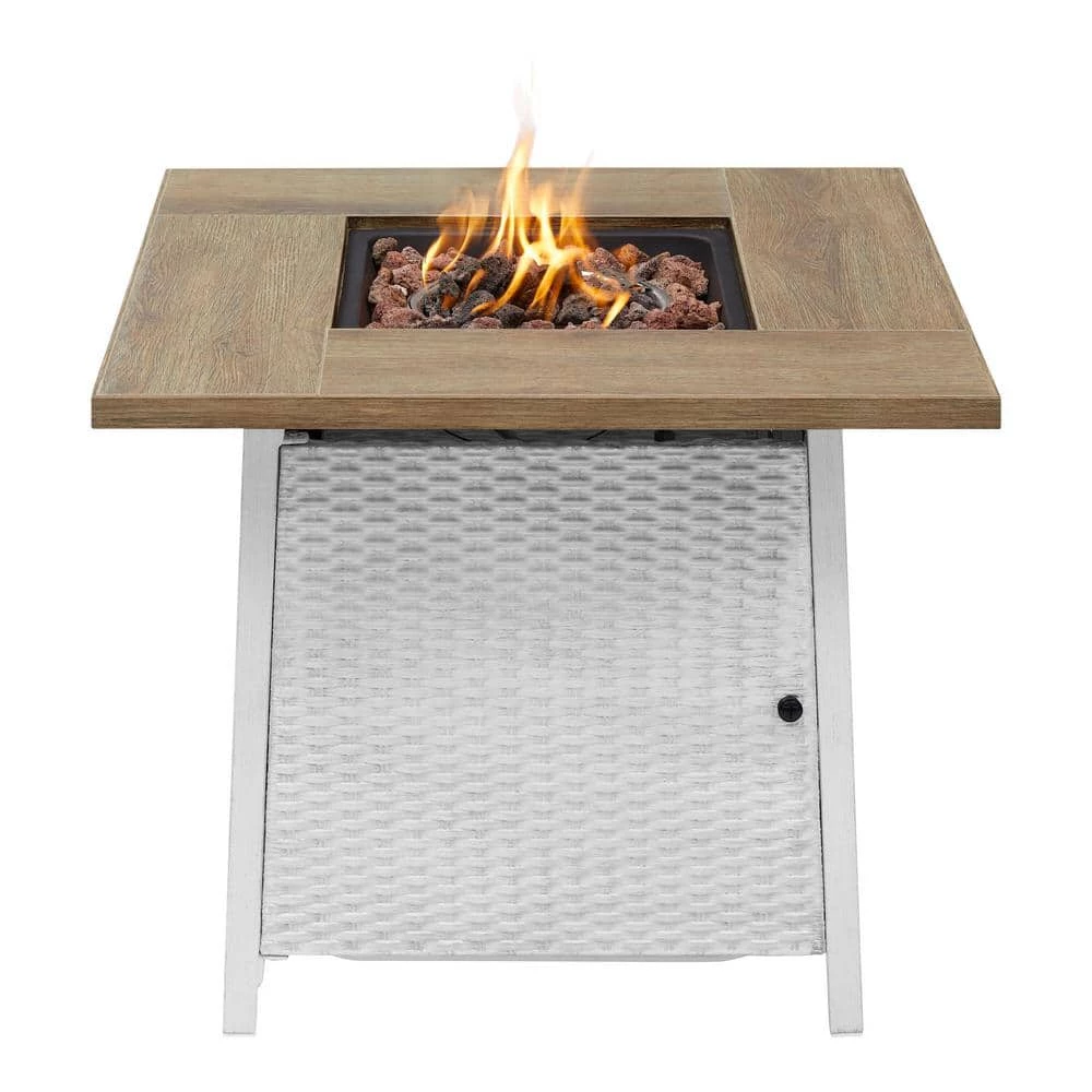 Featuring durable tile and metal construction with unique metal stamped wicker sides, this Tucson fire pit table creates a comfortable and stylish gathering space for outdoor entertainment. It is heat, scratch, weather, and rust-resistant so you can enjoy many seasons of worry-free lounging. The wood-look ceramic tile top creates a beautiful fire table that will fit a variety of decor styles. The fire pit matches the finish and styling of select patio furniture sets and tables from the Home Depot Mix and Match collection. Pair them together for a coordinated backyard design. With 7 ½ inches of mantel around the fire bowl, this 30 in. square gas fire pit offers plenty of tabletop space for dining and entertaining while gathered around the warm flames. Pairs well with light color metal, wicker, or wood patio furniture.