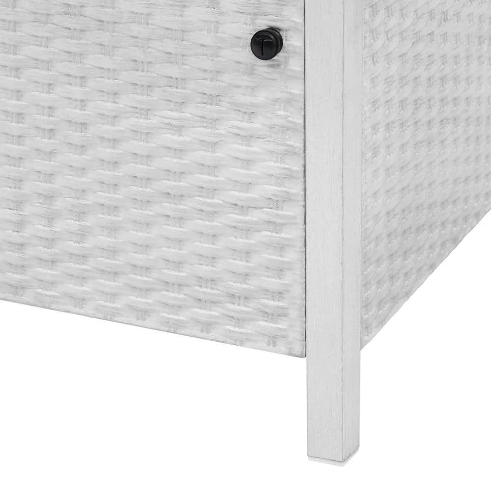 - Metal wicker side panels are painted with a weathered white wood-grain finish