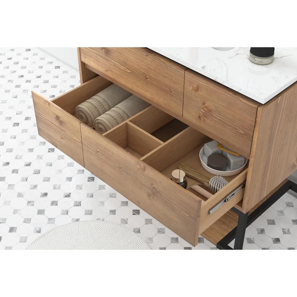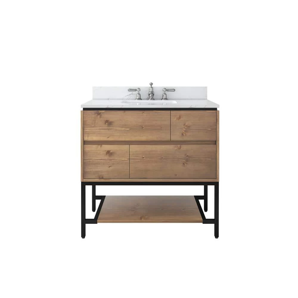 The Ventford Reclaimed Wood 36 in. vanity is the ultimate fit for any bathroom space looking to have a contemporary yet natural look. The vanity comes with a Artificial Carrara marble top, backsplash and a rectangular undermount sink that is both durable and easy to clean. Furthermore, this vanity is built with 2-U-shaped drawers that provides an extensive storage space for the user. This vanity pays homage to an ornamental vibe that can be found in 6-star hotel vacation suites all around the world.