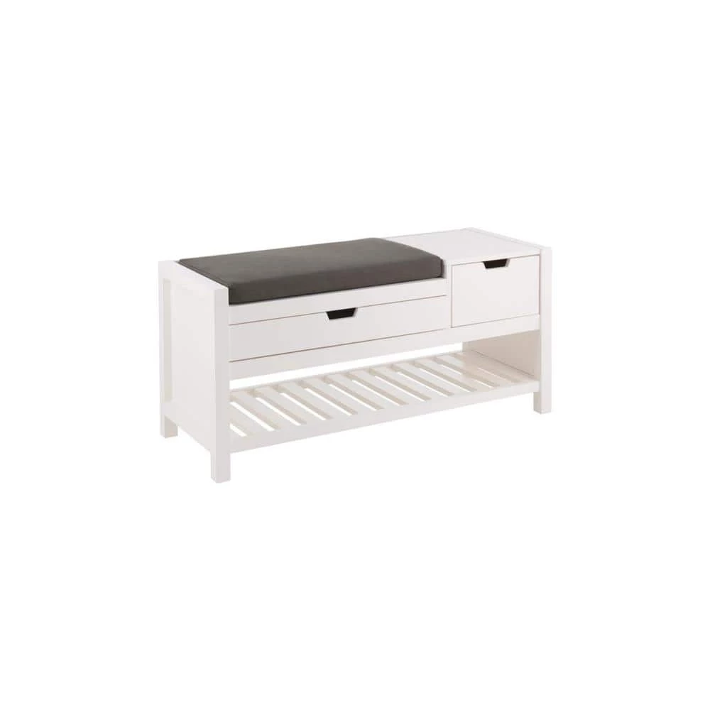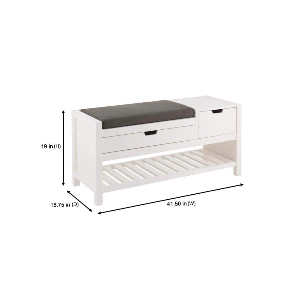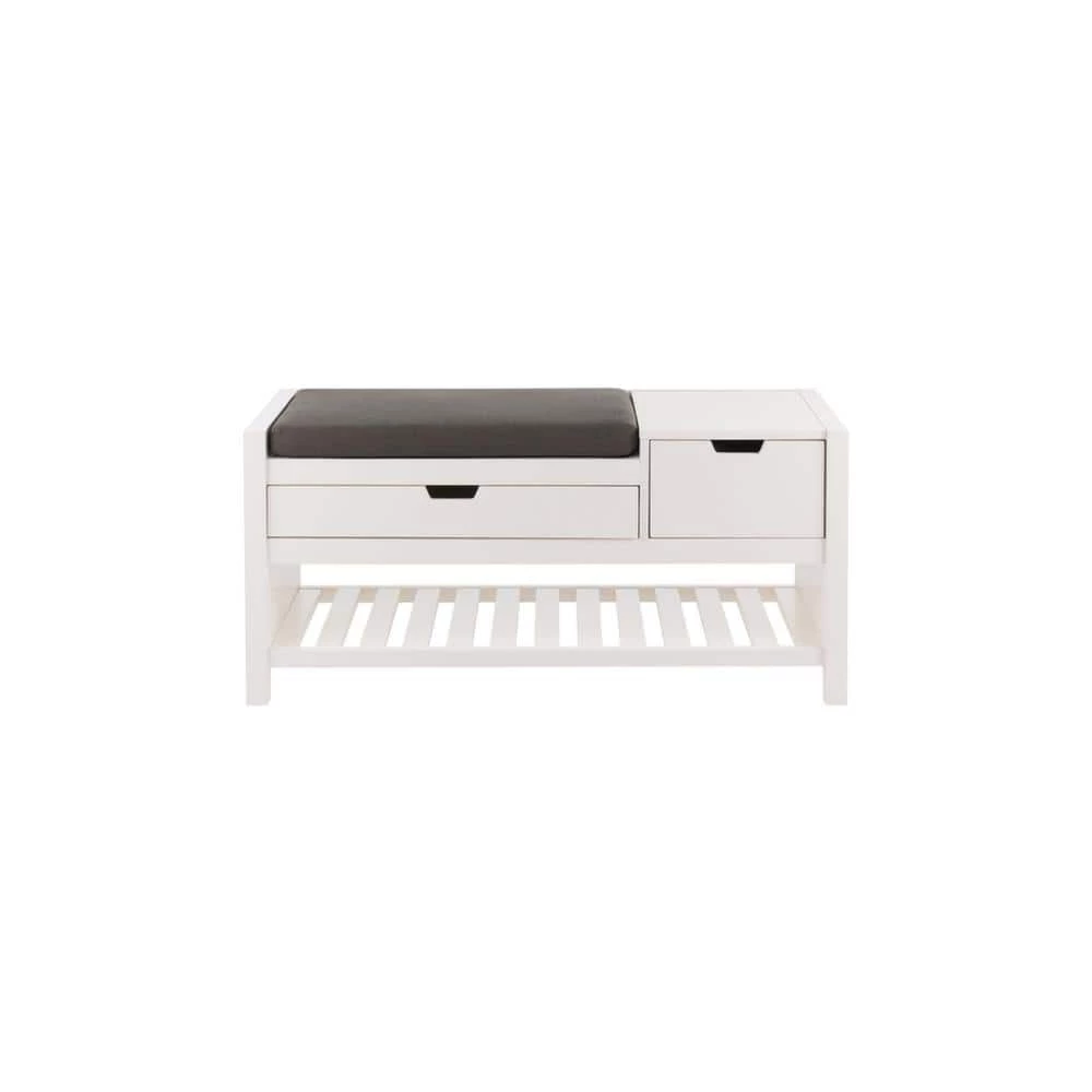 Our Home Decorators Collection entryway bench is smartly designed so everything is comfortably within reach. Relax on the cushioned seat and even more so because it cleans easily if dirt or spills should occur. A smoothly finished table surface holds beverages, keys and mail. Stow hallway and mudroom gear in the two drawers, while the lower shelf easily fits multiple pairs of shoes. The white backless bench’s streamlined design blends in with any modern room.