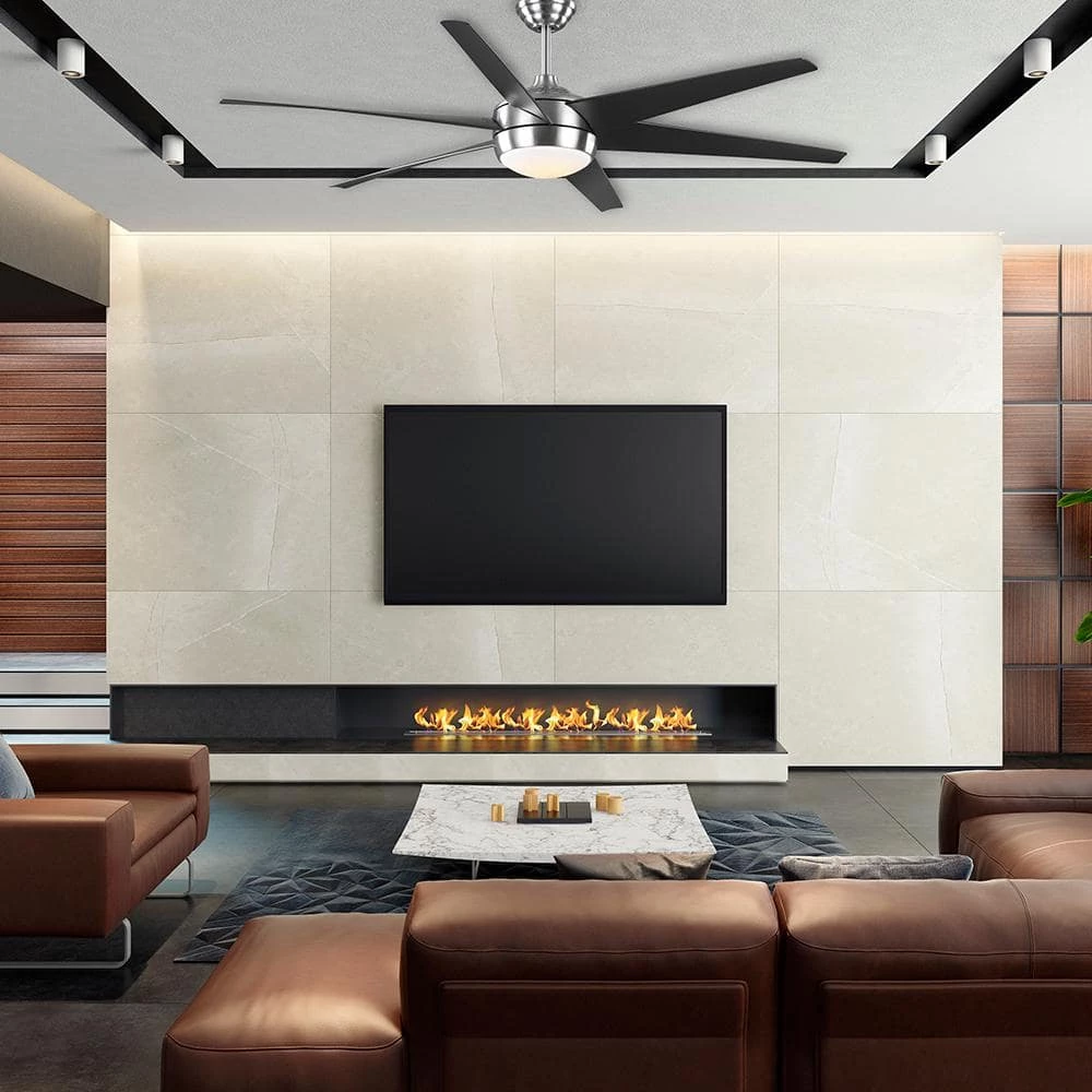 Modern styling and energy efficiency make the 68 in. Windward ceiling fan the perfect choice for any large room application. The Home Decorators Collection took the Windward IV and created a larger version with more features. The integrated 20-Watt LED module is dimmable and allows you to select between 3 color temperature settings – warm white (2700K), soft white (3000K), and daylight (5000K). This damp rated fan is perfect for use in covered outdoor locations like porches and patios. DC motor fans are 70% more energy efficient than AC motor fans (when comparing efficiency (CFM/W) of DC vs AC motors in published FTC Energy Guides for ceiling fans).