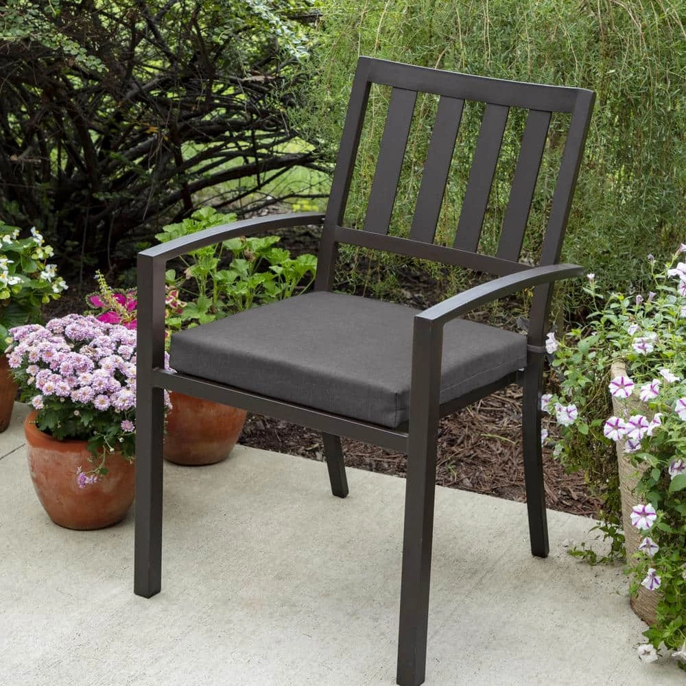 Quiet and calm, Cast Slate’s neutral charcoal resembles the cool, damp rocks that line a hidden pond in the middle of a forest. It’s a tone that is deep and sophisticated, yet has a warmth that radiates out and upward, allowing you to pair it with all colors easily. These 18 x 18 in. outdoor square seat pads are covered in durable and beautiful Sunbrella acrylic fabric, specially engineered with UV protection to resist the elements and maintain bright color season after season. Inside our outdoor cushions we use our patented 100% everLuxe polyester fiber fill to help retain shape and provide long-lasting comfort during outdoor use. Fibers within the cushion are oriented in a vertical position, which provides structure, support, and spring. These outdoor cushions were designed to fit the Woodbury furniture set but are also compatible with most other stacking dining chair frames with square seats. Two ties ensure these cushions stay securely in place no matter the weather. Our outdoor square seat pads also come with a 5-year limited fabric warranty and a 1-year limited warranty against defects in workmanship. Have some fun and transform your backyard into the outdoor sanctuary of your dreams with Home Decorators Collection Cast Slate Square Seat Pads.