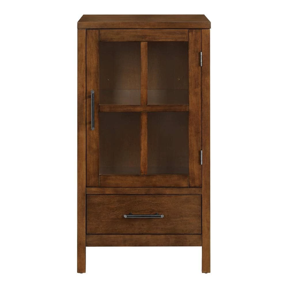 Gain storage where you need it with this stylish and classic cabinet. The tempered glass door with a window pane design adds a decorative touch and opens to an adjustable shelf to suit all of your storage needs. The drawer below is ideal for organizing a variety of small items. The smooth top surface is perfect for displaying photos or your favorite collectibles. This cabinet also features a covered hole in the back for cord management if your display requires electricity. The cabinet comes in a classic Sable finish with Antique Bronze hardware. It is a great stylish storage option for any room in any home. Some assembly required.